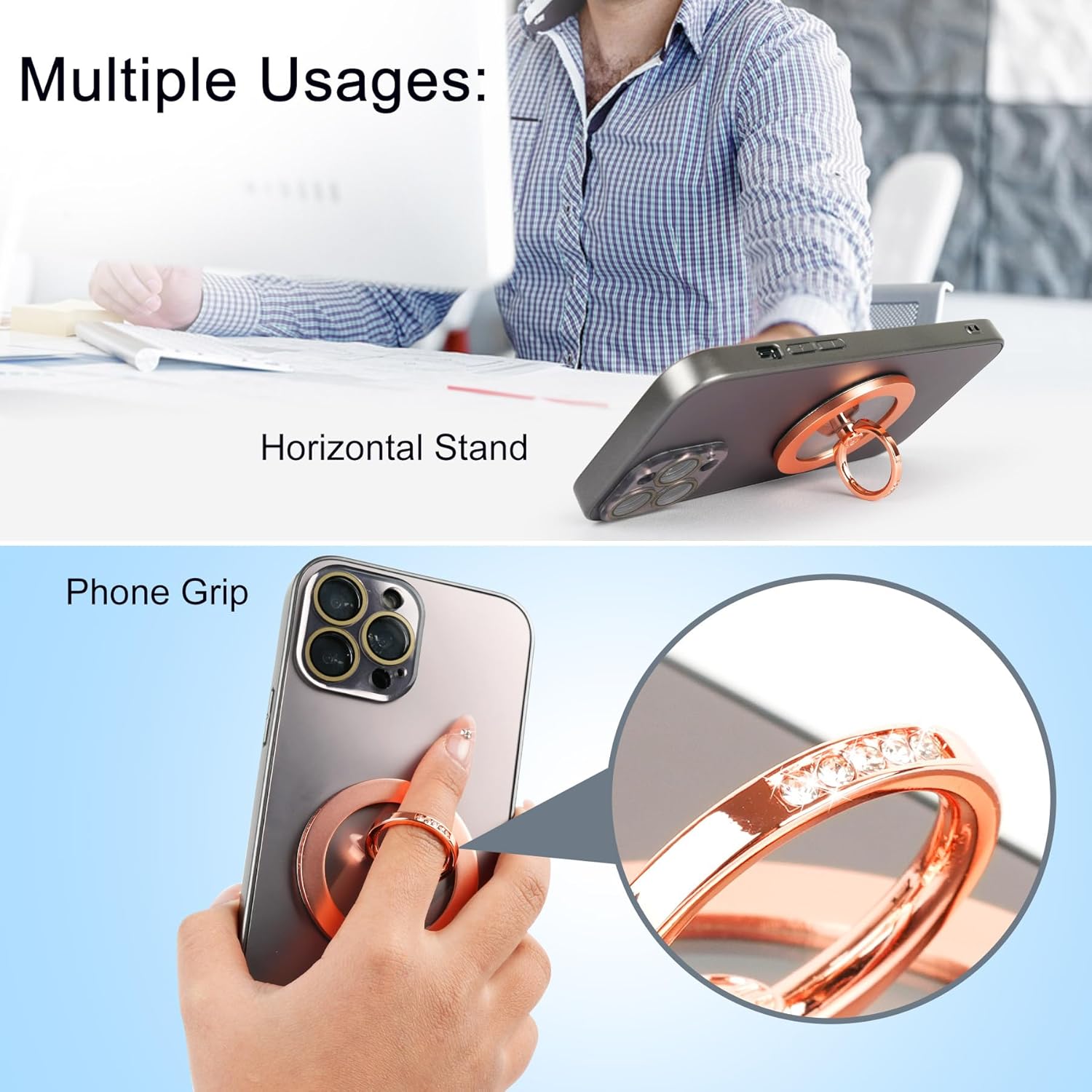 Magnetic Phone Grip for MagSafe, EI Sonador Magnet Phone Ring Holder, Removable, Compatible with iPhone 14 Plus 13 12 Pro Max Mini (Transparent Rose Gold Diamond)
