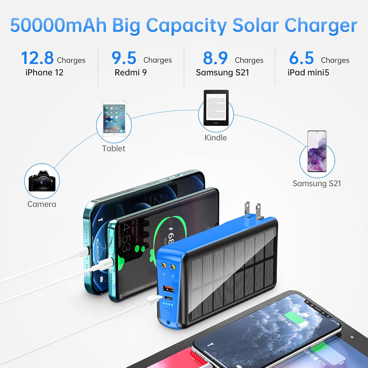 Portable Charger with Built in Cable and Wall Plug 50000mAh PD30W Fast Charging Solar Power Bank with 5 Output & 2 Input Dual LED Flashlights Phone Holder External Battery Pack (Blue)