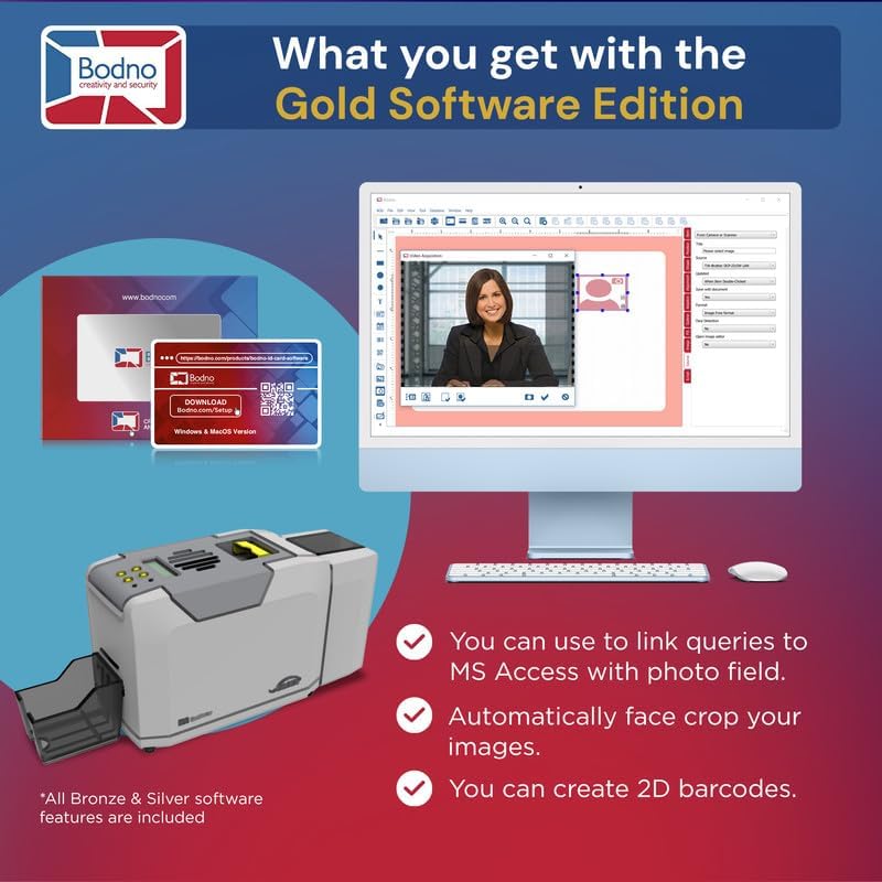 - BODNO GOLD EDITION WITH LIFETIME LICENSE: Advanced features include 2D barcode printing, automatic face cropping, and seamless integration with MS Access and SQLite databases.