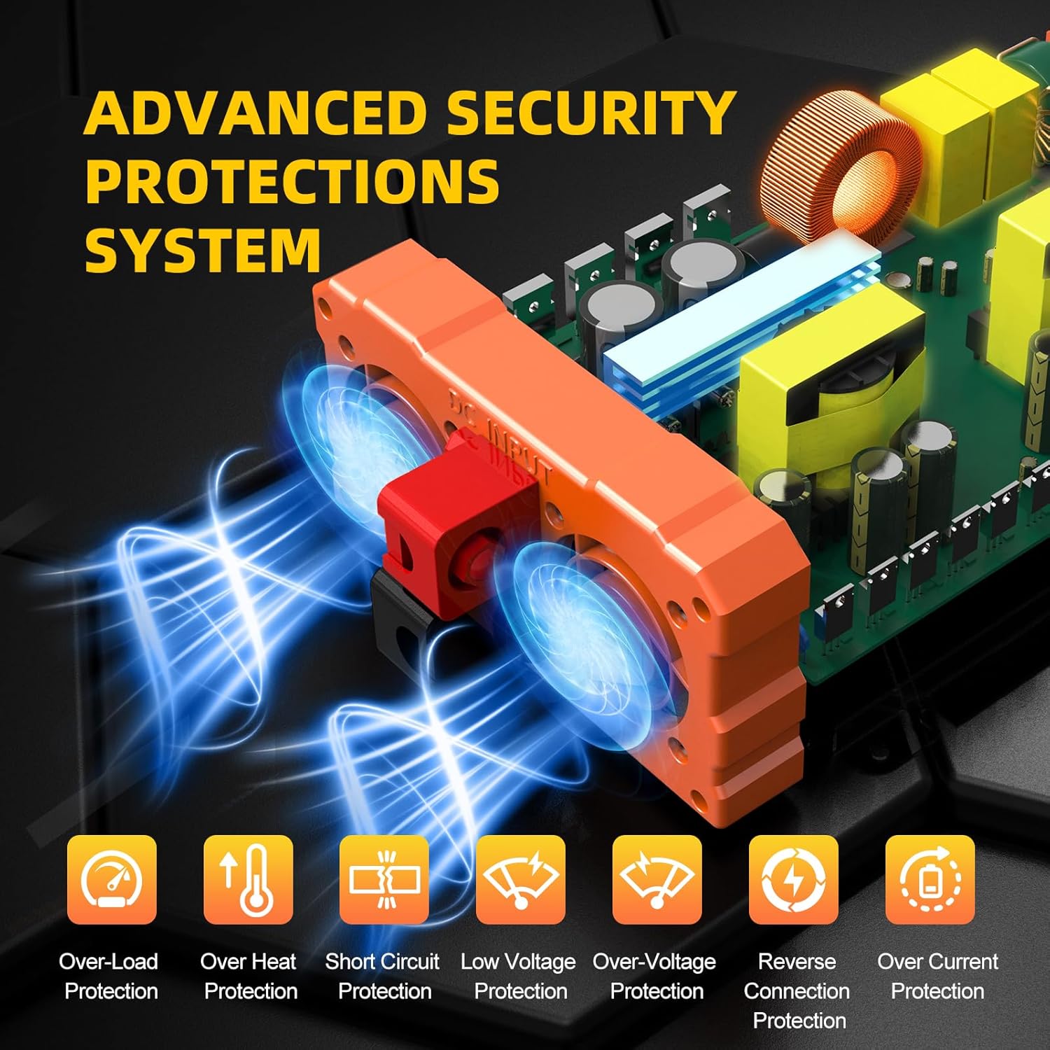 - 【MULTIPLE SAFETY PROTECTIONS】: Pure sine wave inverter provides undervoltage, overvoltage protection, overload, over temperature protection, short circuit and reverse connection protection. Aluminum and sturdy plastic housing ensures long term use