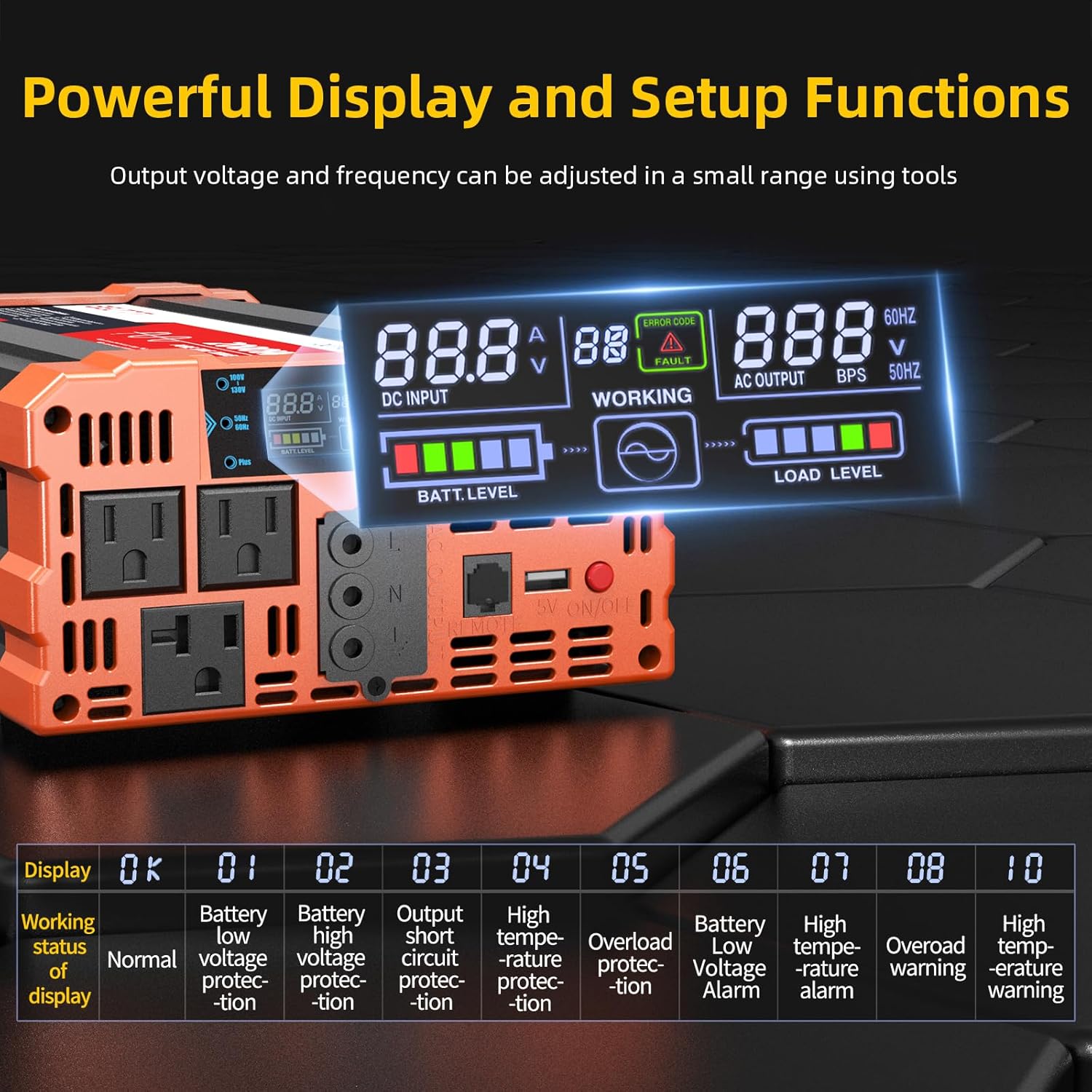 - 【INTELLIGENT LCD DISPLAY】: This 2000Watt inverter comes with a high-brightness real-time smart screen that simultaneously displays input and output voltages, battery and load status, multiple operating conditions for timely troubleshooting. At the same time, the output voltage and screen can be adjusted independently in a small range