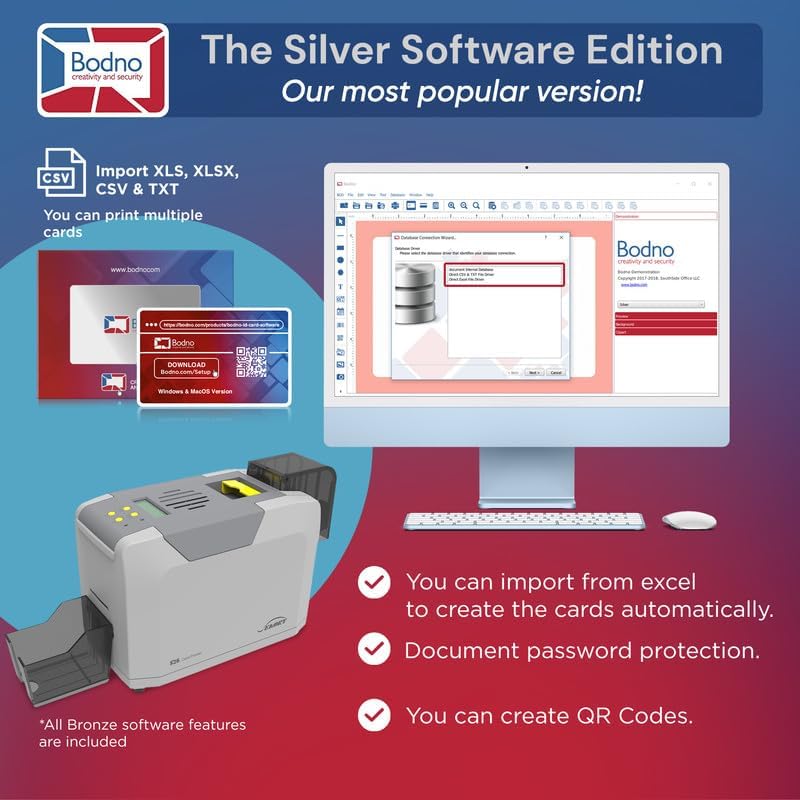 - BODNO SILVER EDITION WITH LIFETIME LICENSE: Expands on Bronze features by adding functionality to auto-create cards from Excel or CSV files, enhancing productivity.