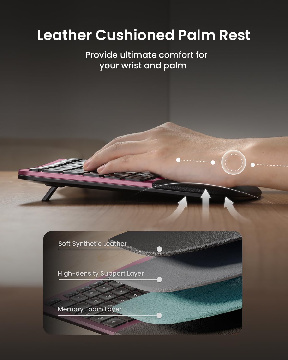 - Cushioned Wrist Rest: Curved wrist rest with soft memory foam layer offers typing comfort with more wrist support, less wrist bending compared to other standard keyboards without wrist rest. Adjustable tilt legs design positions the keyboard at a perfect angle to keep your wrist in a relaxed and comfortable typing posture whether seated or standing.