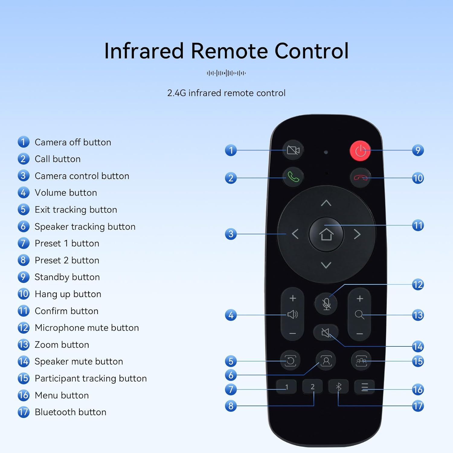 - Easy to use; The TC201 conference room camera Support wireless connection BT 5.0; Multiple connection methods; such as HDMI; USB 3;0; type-c; and wireless connecting with phones; ensures that the meeting goes smoothly regardless of the type of terminal equipment (Tips: We also provide a wall mount bracket to make your installation hassle-free)
