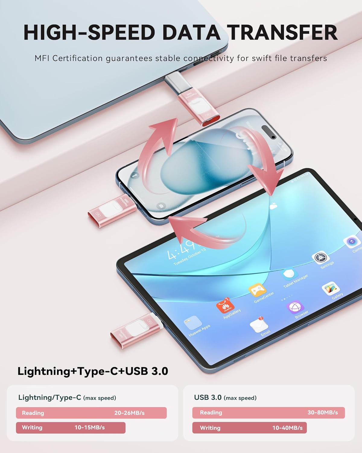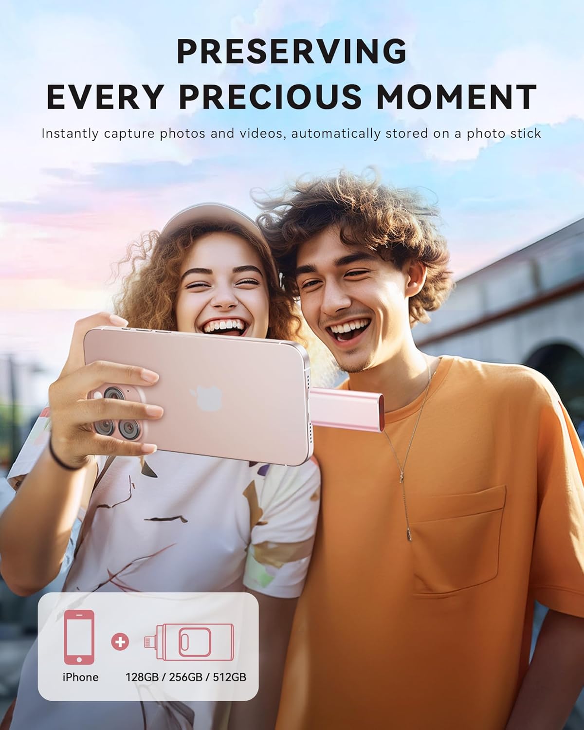- Compact & Convenient: This MFi-Certified 128GB iphone photo storage stick helps you solve storage issues on your iPhone/iPad/PC, allowing you to easily back up your photos, videos, and phonebook with just one click using the app USB drive. (Note: To use this iphone memory stick on an iPhone/iPad, please download and install the "ROSPE" app from the App Store. For Android phones, simply enable the OTG function, no need to download any additional apps.)