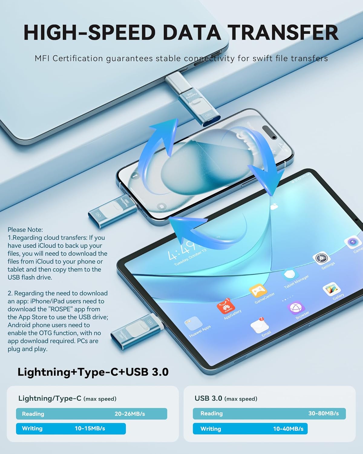 - Compact & Convenient: This MFi-Certified 128GB iphone photo storage stick helps you solve storage issues on your iPhone/iPad/PC, allowing you to easily back up your photos, videos, and phonebook with just one click using the app USB drive. (Note: To use this iphone memory stick on an iPhone/iPad, please download and install the "ROSPE" app from the App Store. For Android phones, simply enable the OTG function, no need to download any additional apps.)