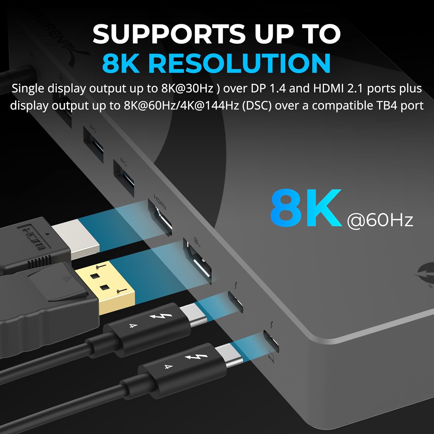 - Display It All: This docking station can output with its DP 1.4 and HDMI 2.1 ports at up to 8K@30Hz and TB4 port at up to 8K@60Hz/4K@144Hz (DSC), with HDR & HDCP2.3 support. Enjoy dual display at up to 4K@60Hz/4K@60Hz with MST and triple with Windows.