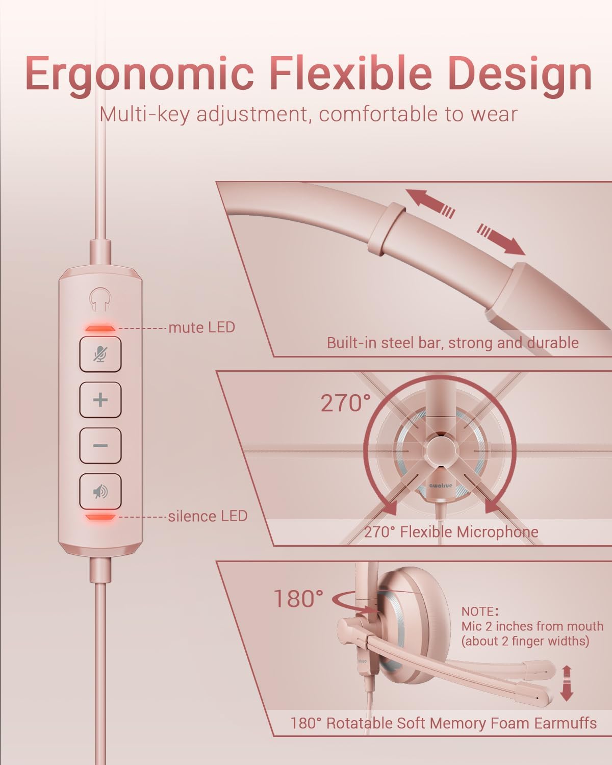 Computer USB Headset with Microphone for PC Laptop - WiredHeadphones with in-Line Control, Lightweight, Enhanced Sound & MIC Mute(Pink)