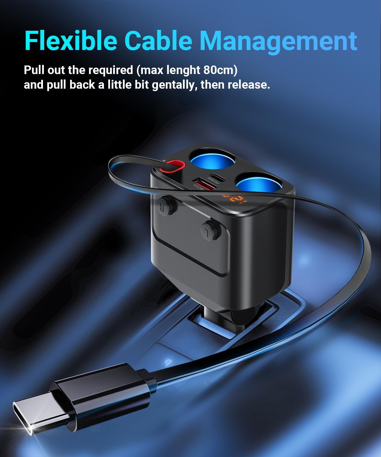 - 【Retractable Cable for a Tidy Car Interior】Retractable car charger can pull out the cable within 80cm/2.6ft. The retractable design eliminates the need for extra cables, offering convenience and cleanliness.No more tangled wires—keep your car neat and organized!