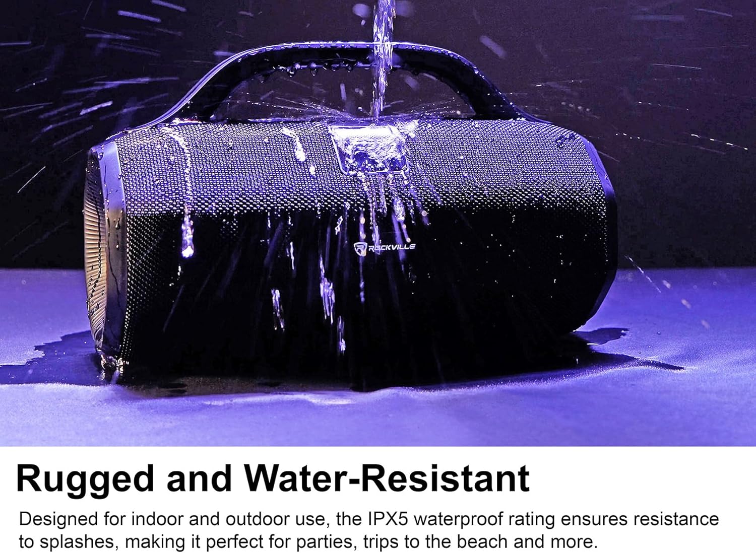 - RUGGED AND PORTABLE: IPX5 water-resistant design with a carry handle and rubber input cover for added durability; roller volume knob for easy control.