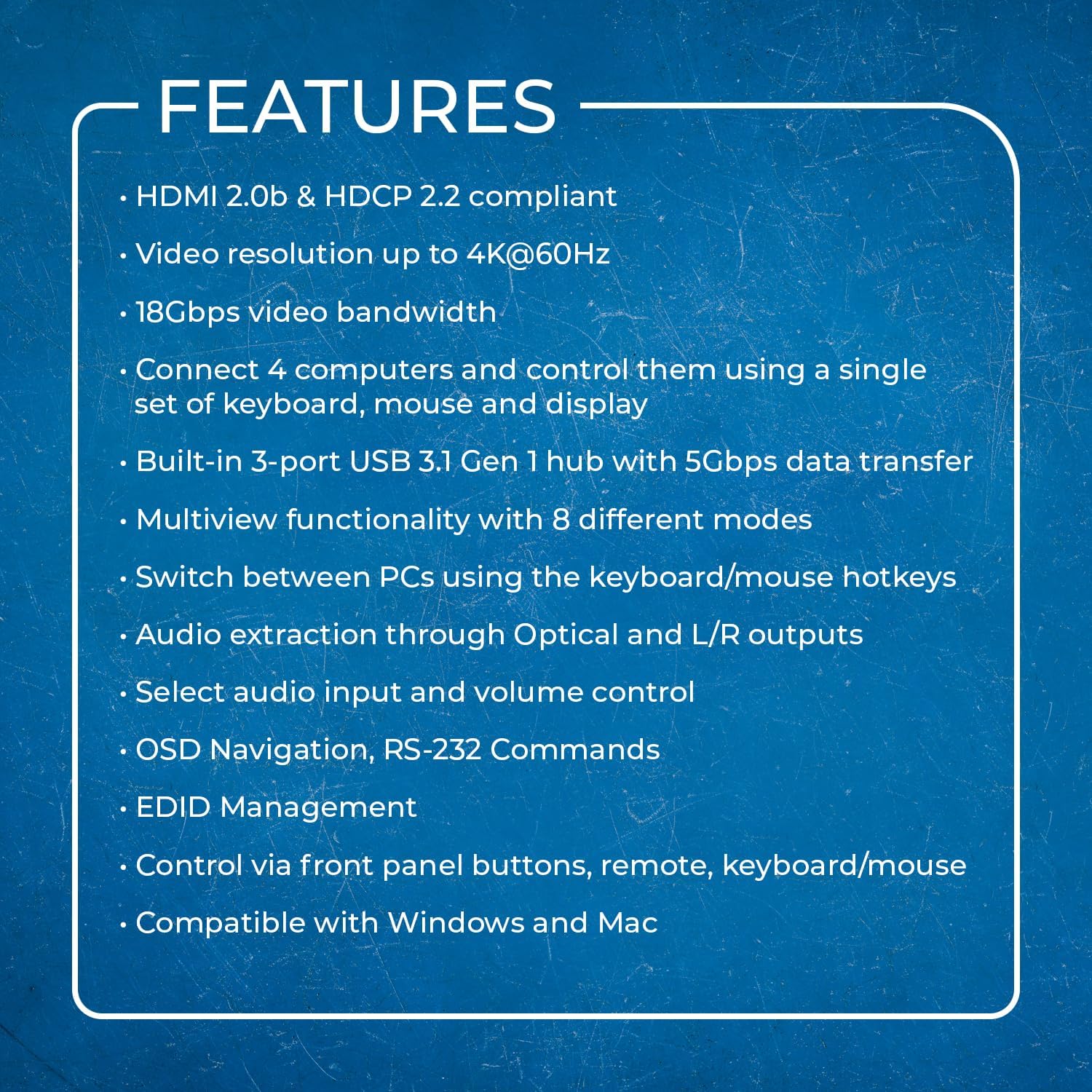 - 4K 2.0a (18Gbps) 4 HDMI input + 4 USB HOST input into 1 output Single Monitor Switcher - This device lets you share 4 PCs, Desktops with one Display Monitor also View all 4 desktops on one Display at once in Quad Multiviewer mode. Also lets you share 3 x USB 3.1 Gen1 Hub with Super Speed 5gbps data transfer inputs with all four PCs.