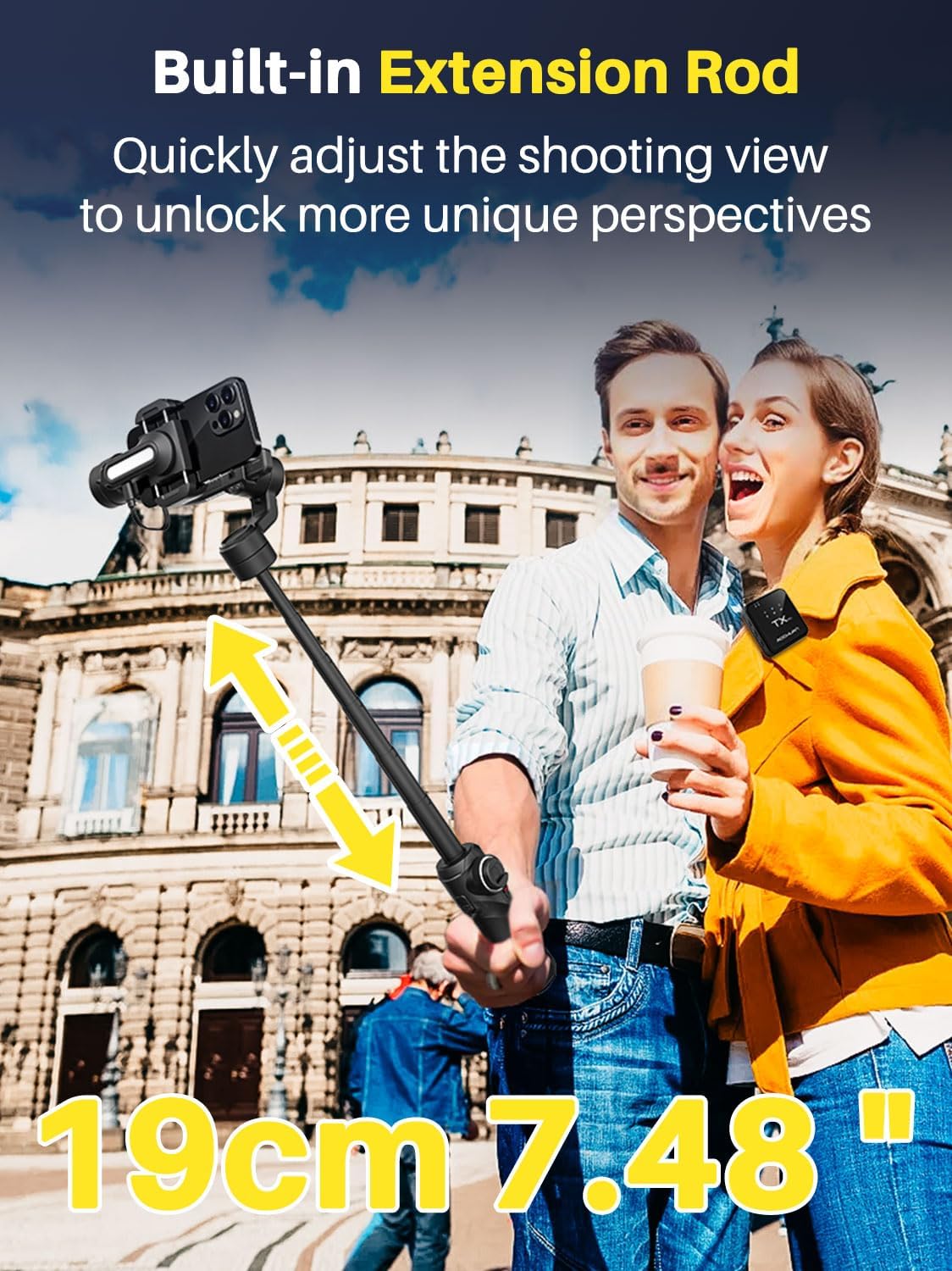 - Versatile Mode with 360° Rotation: With its 3-axis capable of unlimited rotation, Smart S2 phone stabilizer empowers you to shoot creatively without constraints. The built-in fill light allows for shooting in low-light conditions without the need for extra equipment. An integrated 18 cm extension rod expands your field of view, while the stabilizer can easily transform into a selfie stick for group photos with friends, enhancing your shooting versatility.