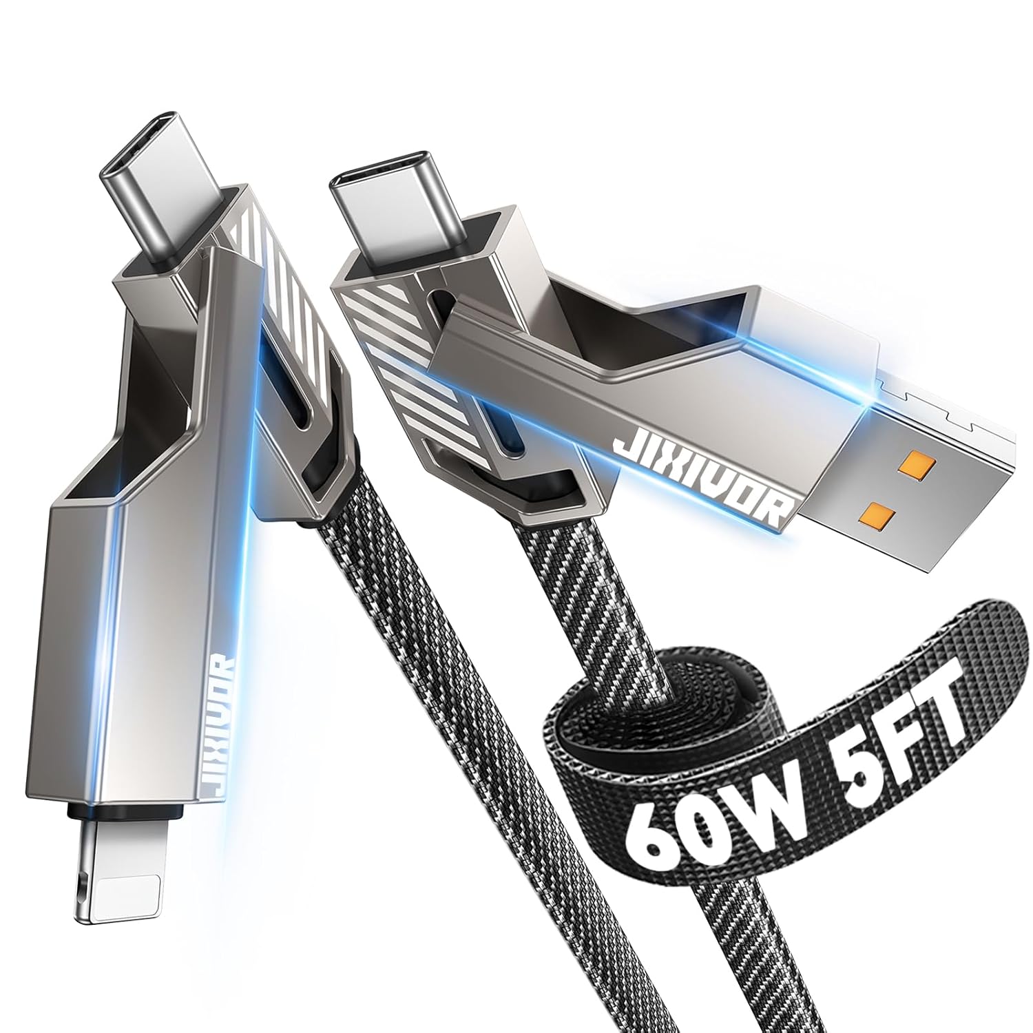 - 60W Fast Charging & 480mbp/s Data Transfer: 4-in-1 USB cable offers high-speed and safe charging up to 60W, enabling faster charging compared to standard cables. It can charge a Samsung S24 Ultra phone to 80% in 30 minutes (actual speed depends on your device and charger). The cable supports data transfer at 40-60MB/s, allowing a 1GB file transfer in 20 seconds. Compatible with iPhone, Samsung, tablets, Air, Mini, Pro, MacBook, and more, this cable saves time and enhances efficiency
