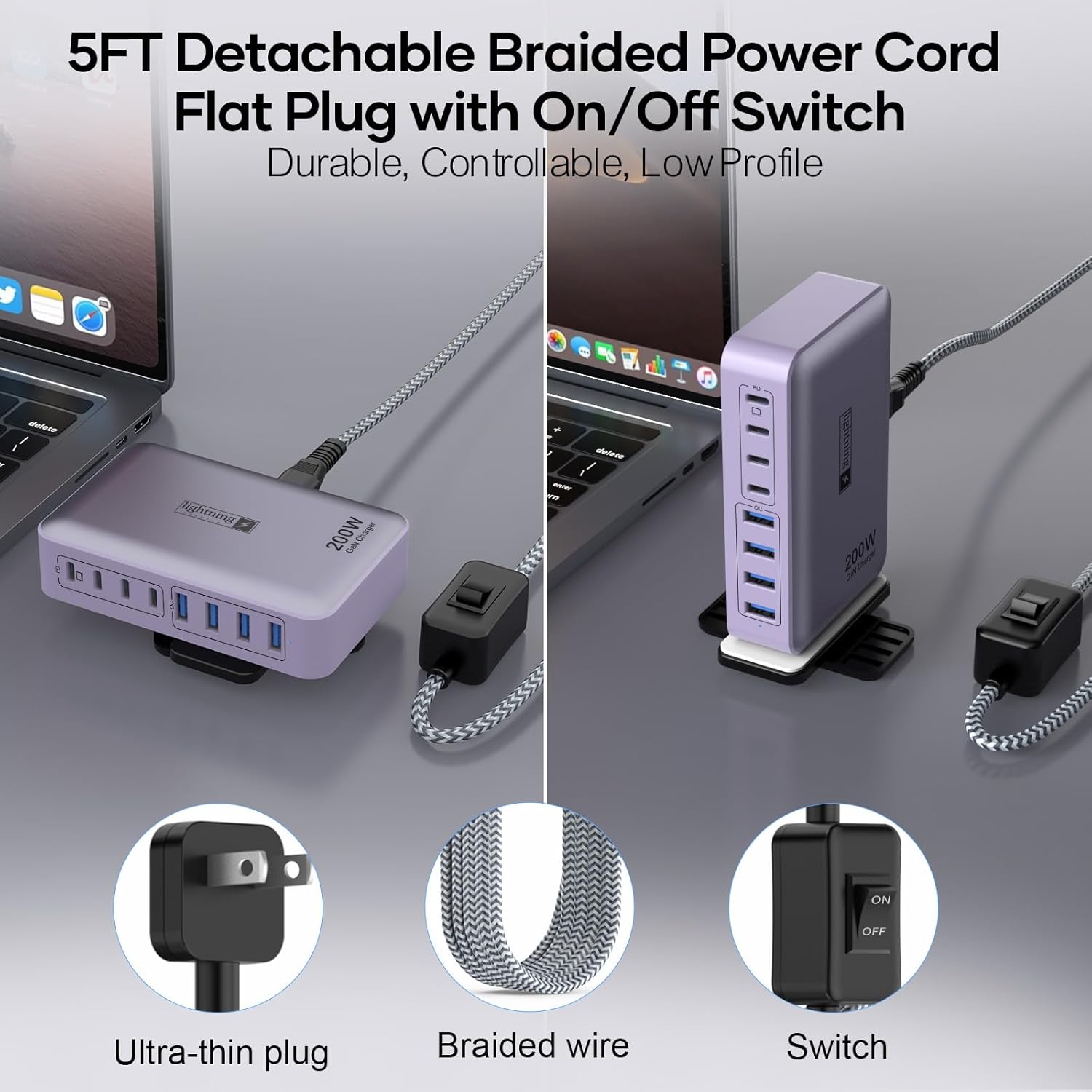 8-Port Type C Fast Charger Block 200W with Flat Plug, Braided Power Cord, and On/Off Switch- USB Charging Hub for iPhone, iPad, MacBook and More- 65W C Port Power Adapter for Laptops