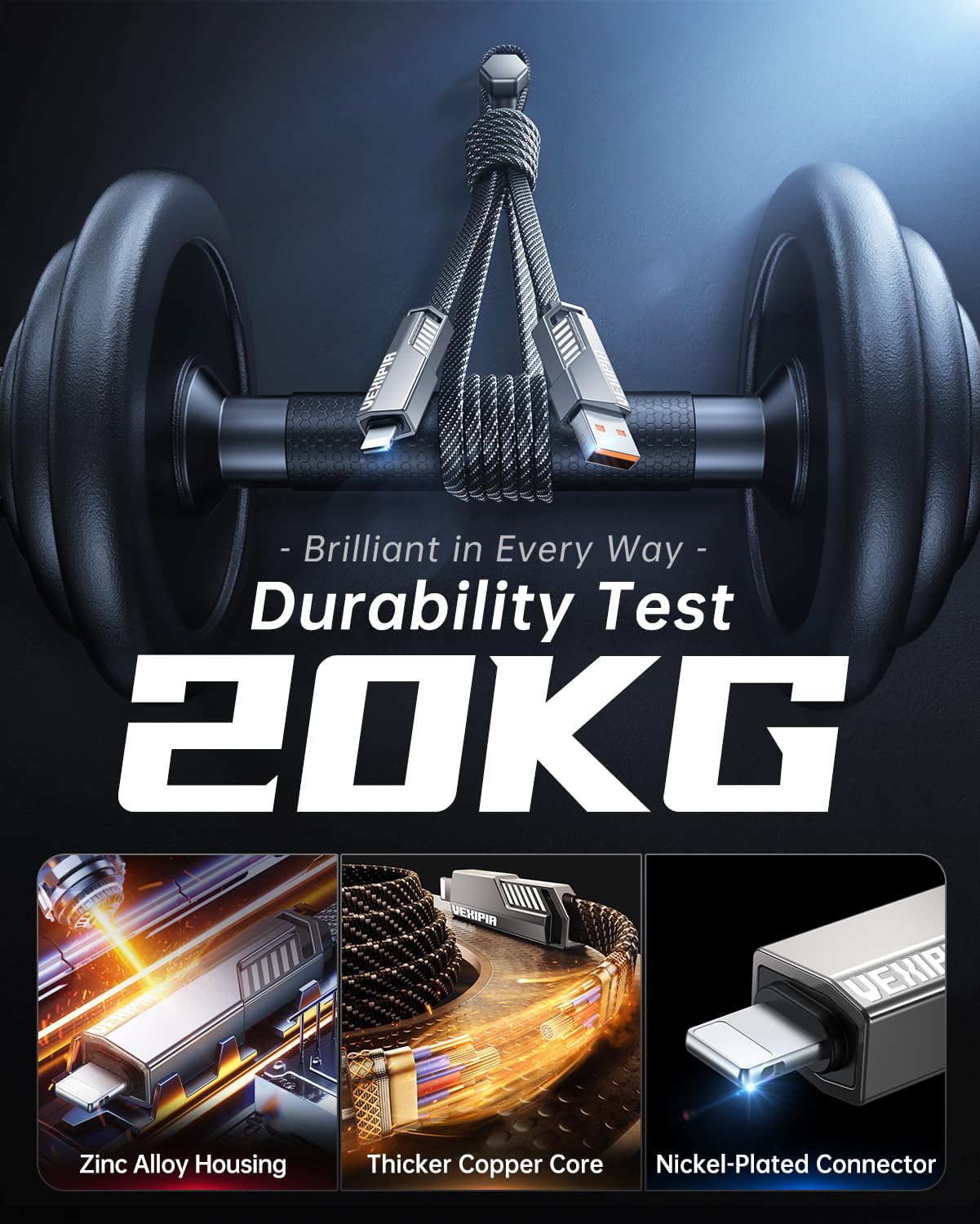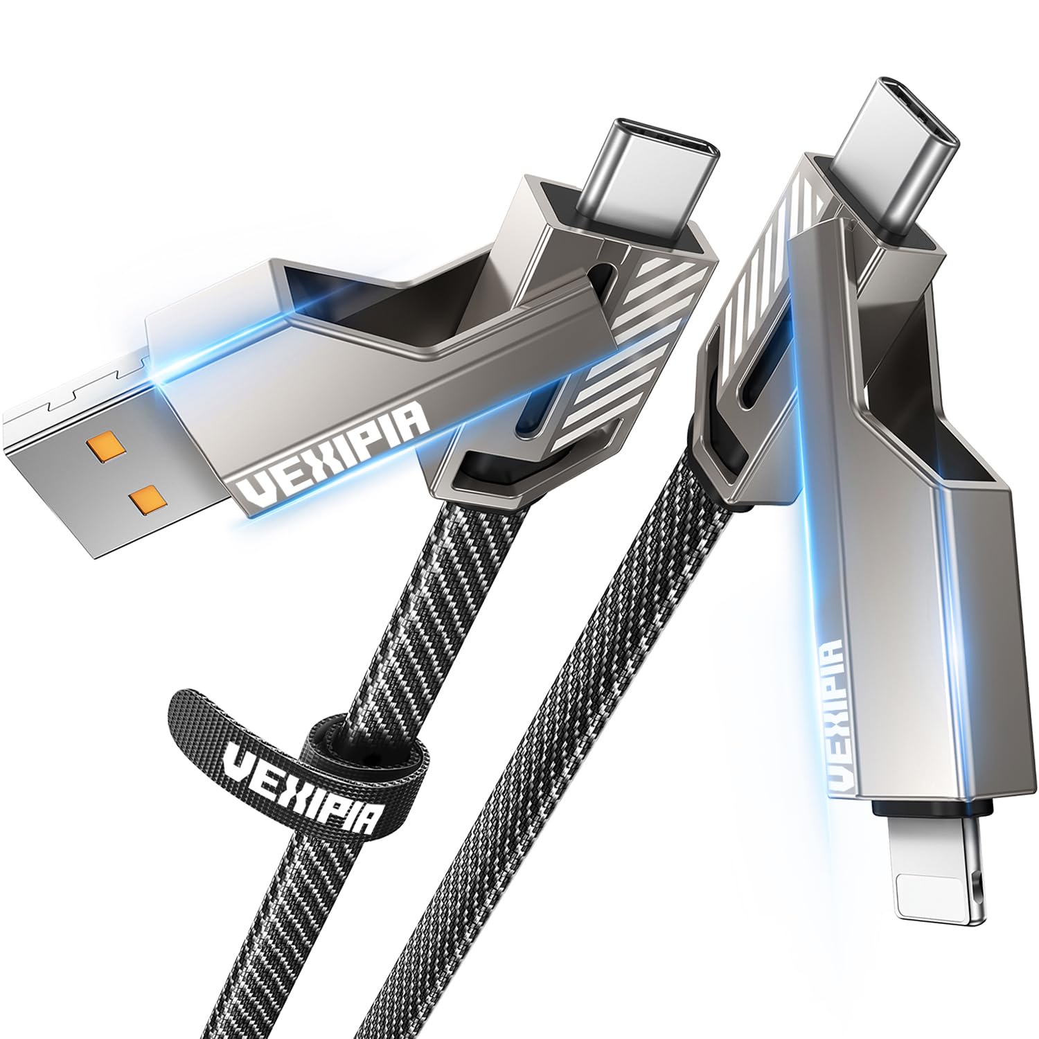 - 4-IN-1 Versatile Design: Our USB-C cable covers all your charging needs with 1 USB-A port, 1 Lightning port, and 2 USB-C ports. Compatible with most devices, it’s perfect for travel and everyday use, offering ultimate convenience in a single cable