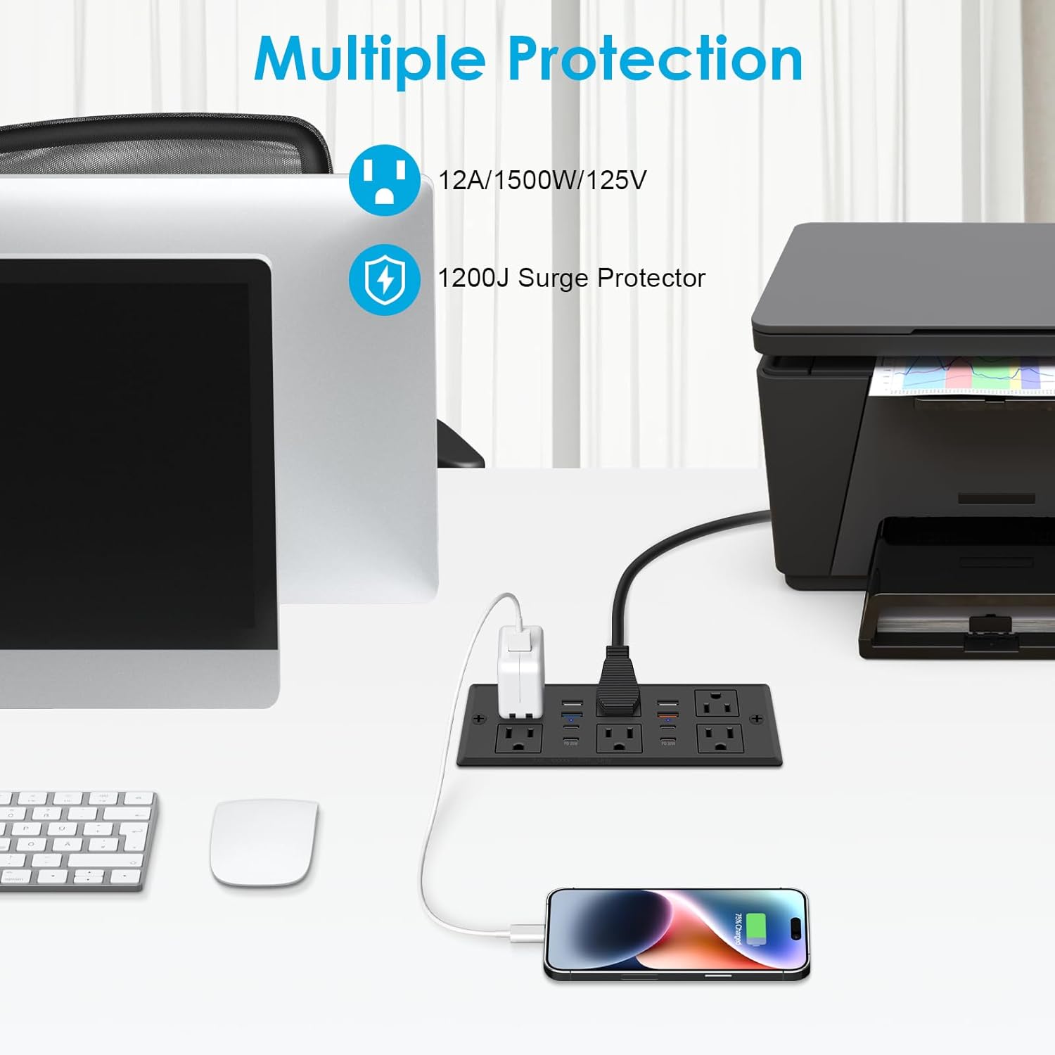 Recessed Power Strip with PD 30W Fast Charging, Conference Desk Flush Mount Outlets Plug in 6 Outlets & 8 USB Ports,3FT Cord Furniture Drawer Outlet Black