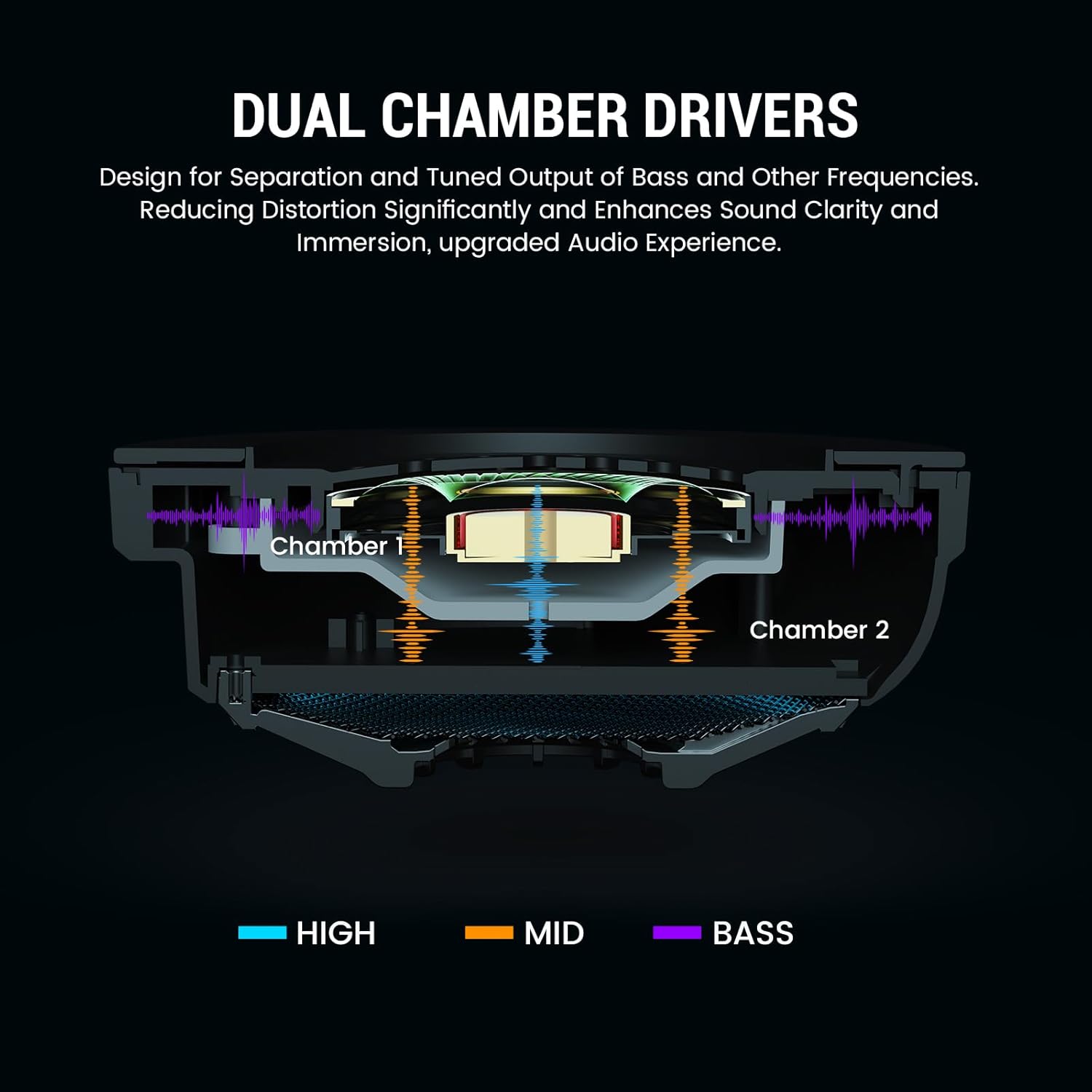 - DUAL CHAMBER DESIGN: Featuring an innovative dual chamber design, the low and high-frequency sounds are processed separately to ensure all frequency ranges can be optimized independently. The low-frequency chamber enhances the deep, full bass effects, while the high-frequency chamber delivers clear and bright highs, creating a richer and more dimensional sound experience. This enhances the sound details and accuracy in gaming, thus improving the overall gaming experience.