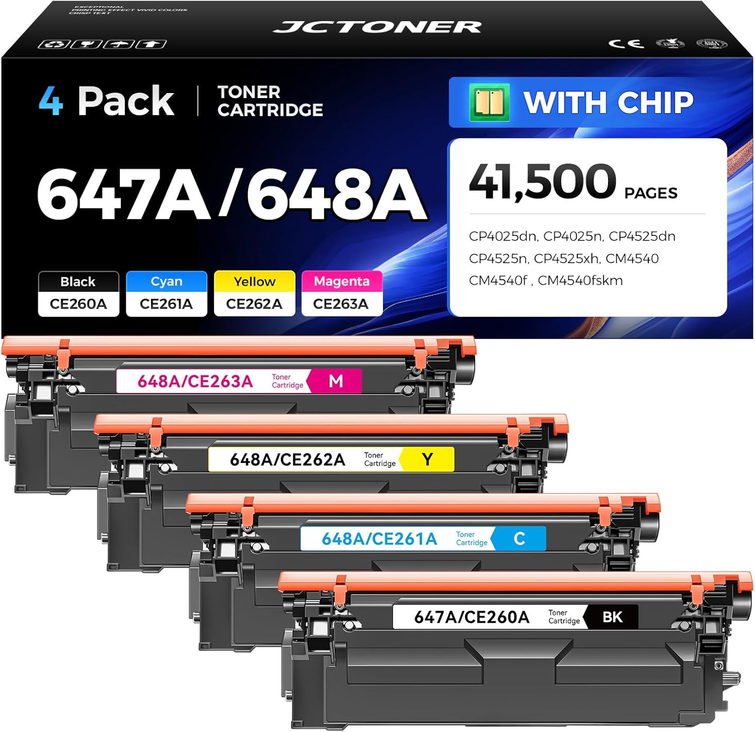- Package Contents: Total 4 pack 647A/648A toner cartridges + 1x user manual, (1*Black CE260A Toner, 1*Cyan CE261A Toner, 1*Yellow CE262A Toner, 1*Magenta CE263A Toner).