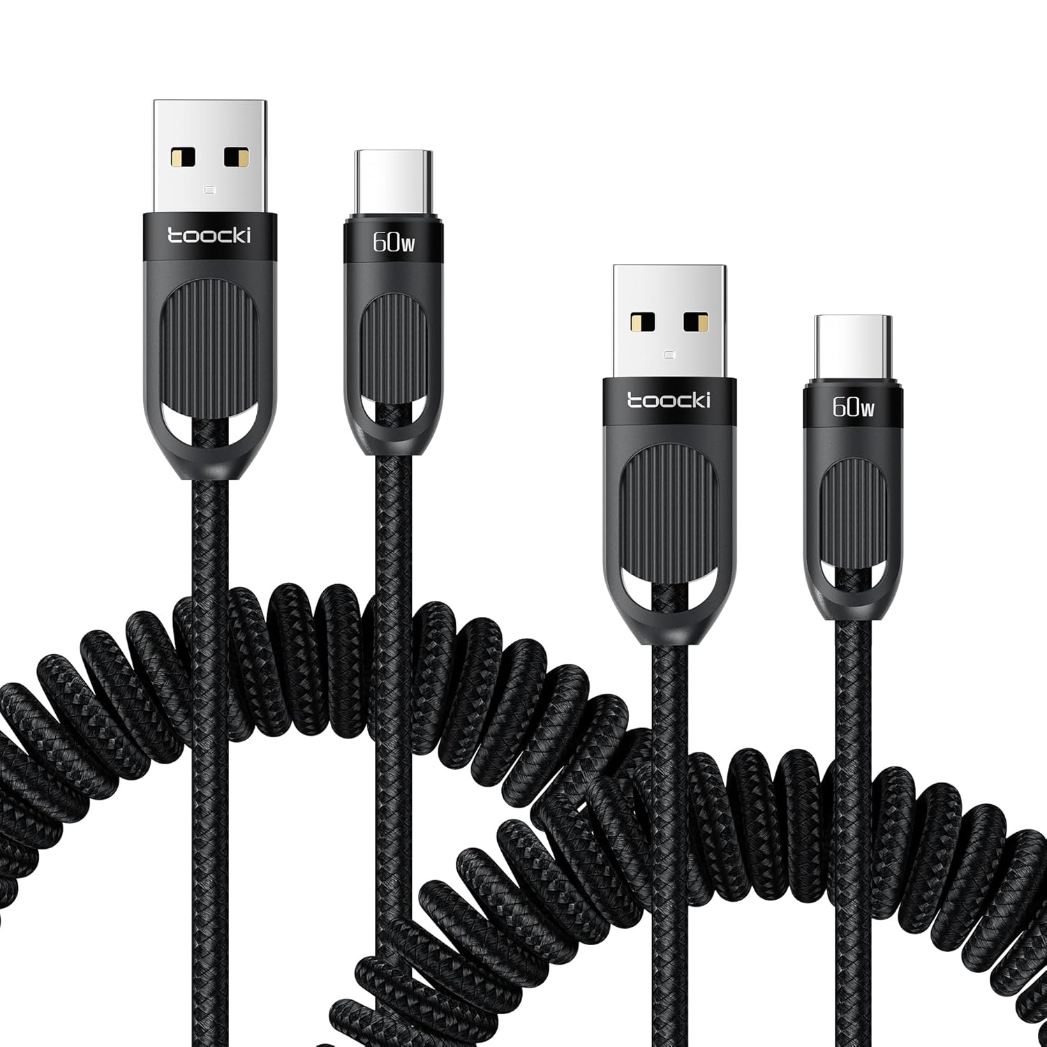 Coiled USB A to USB C 2Pack 3FT Braided Retractable Fast Charging Cable for Car, Compatible with iPhone 16/15 Pro Max/Galaxy S24/S23/S22, Supports Car Play & Android Auto-Black