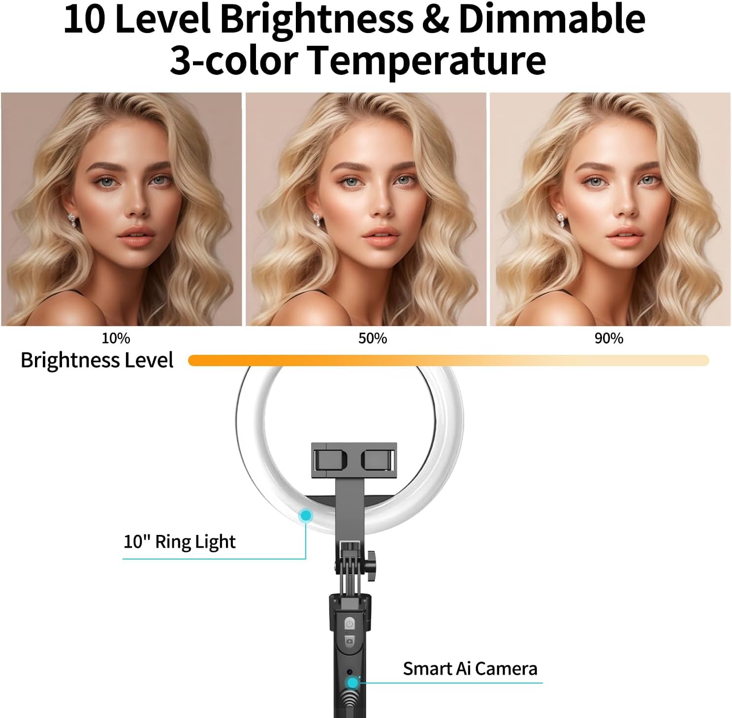 - 【Motion Tracking Tripod with 10" Ring Light】This motion tracking tripod comes with detachable 10" ring lights that you can choose to install to improve the quality of your videos when there is not enough light to record them. The ring lights have 3 colour modes (warm, cool and natural) and each mode has 10 levels of brightness.