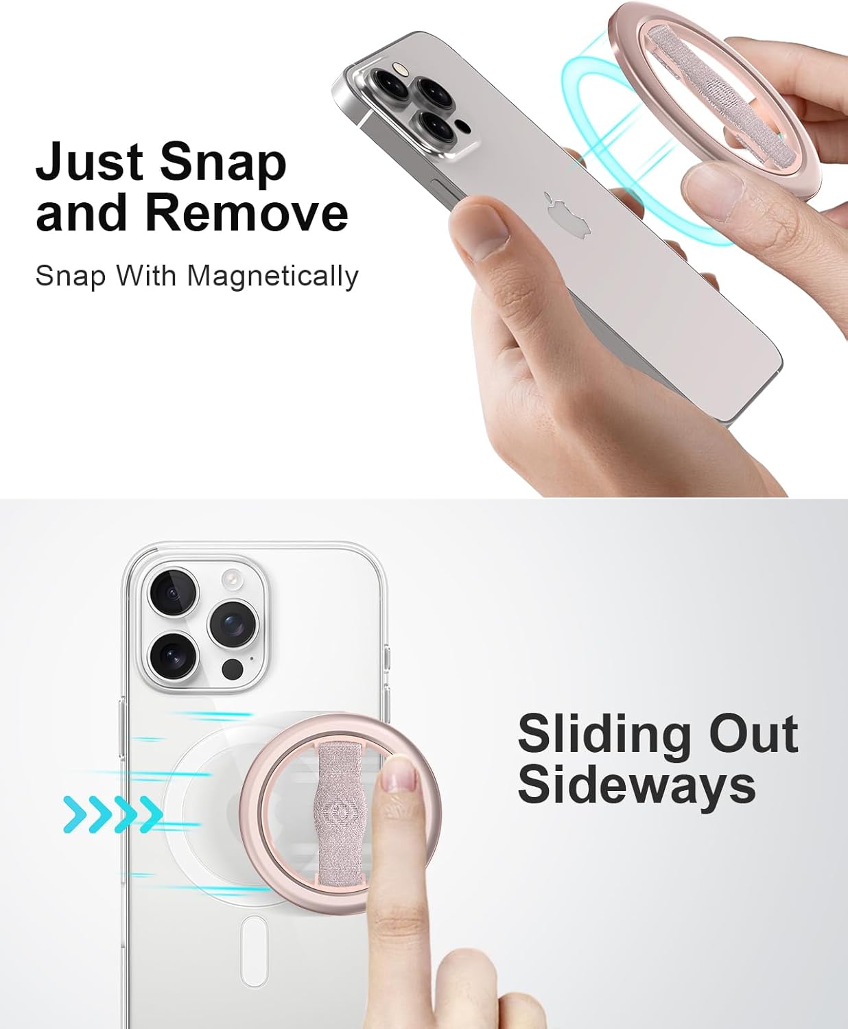 EWA MagOne Lite 3rd Gen Cell Phone Ring Holder, with Replaceable 360° Rotation Elastic Finger Strap, Phone Grip Compatible with iPhone MagSafe,15,14,13 Pro/Max/Plus-(Pink)