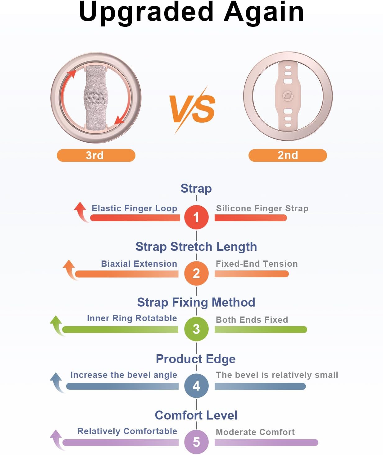 - Comfortable Elastic Phone Grip: This strap features a more comfortable and highly stretchable high-elastic strap, with a looped band that offers double the extension length, greatly reduced the pressure on the fingers when using the strap. The strap is fixed on a rotatable inner ring, allowing you to easily adjust your phone to the most comfortable angle while using the grip.
