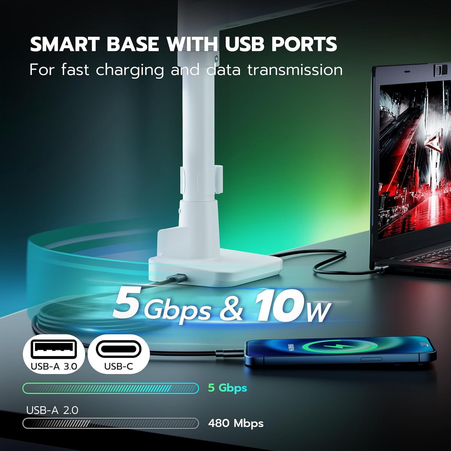- Smart Base with USB-A/C Ports – Designed to declutter your workspace, this vesa monitor mount not only tackles cable chaos but also frees up over 80% of your desktop area. Equipped with integrated USB 3.0 ports, it offers seamless charging for your smartphones, gaming equipment, and convenient data transfer. By reclaiming valuable desk space, it creates room for your personal gadgets and décor, enhancing both your productivity and workspace aesthetics.
