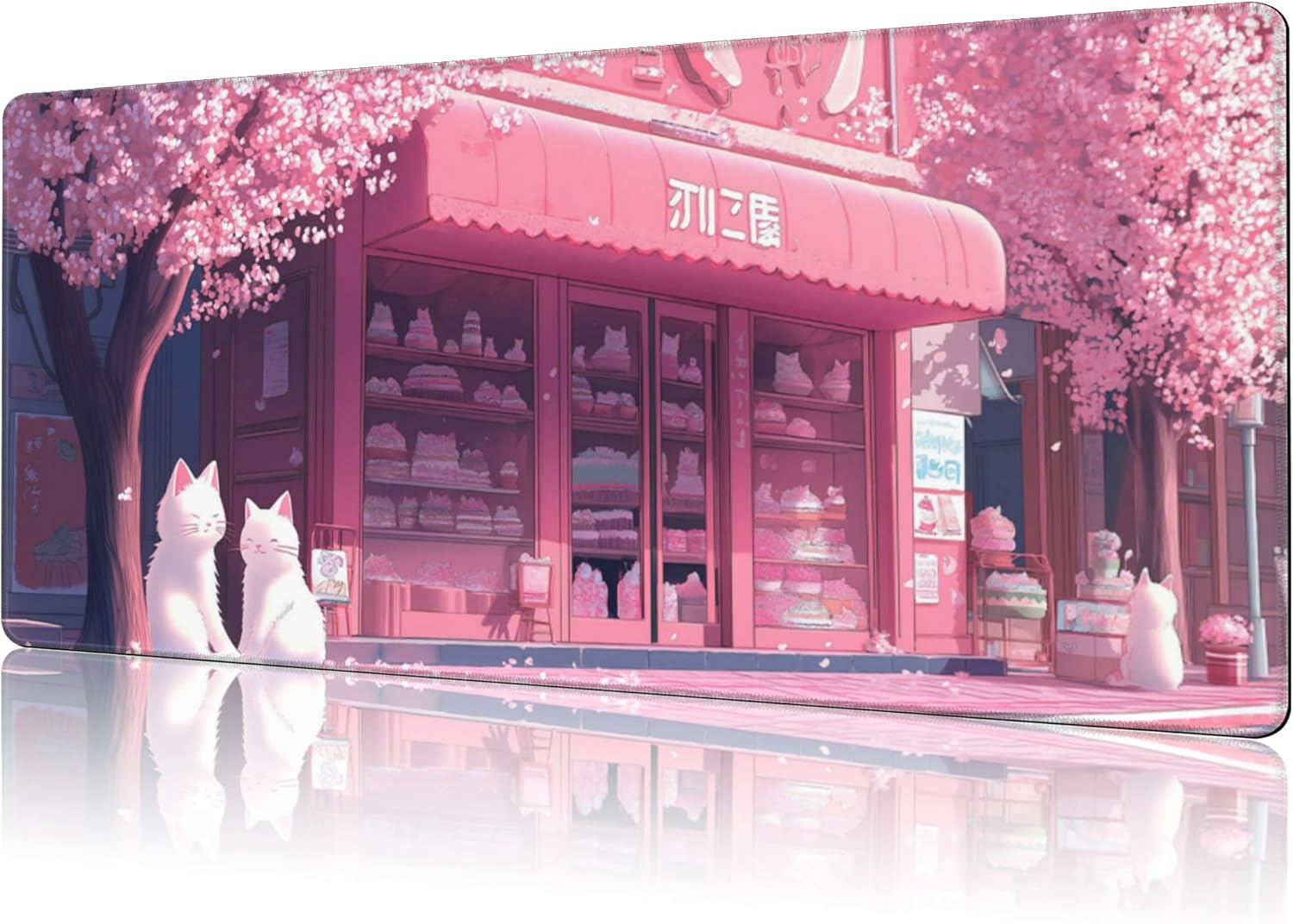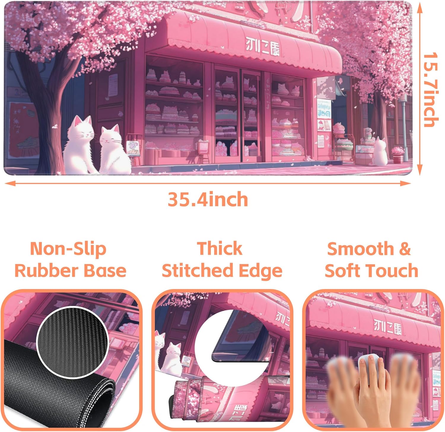 Mouse Pad Large Cake Shop and White Cats Non-Slip Gaming Desk Mat with Stitched Edge Laptop Keyboard Desk Pad for Work Home Gaming (35.4 x 15.7 Inches)