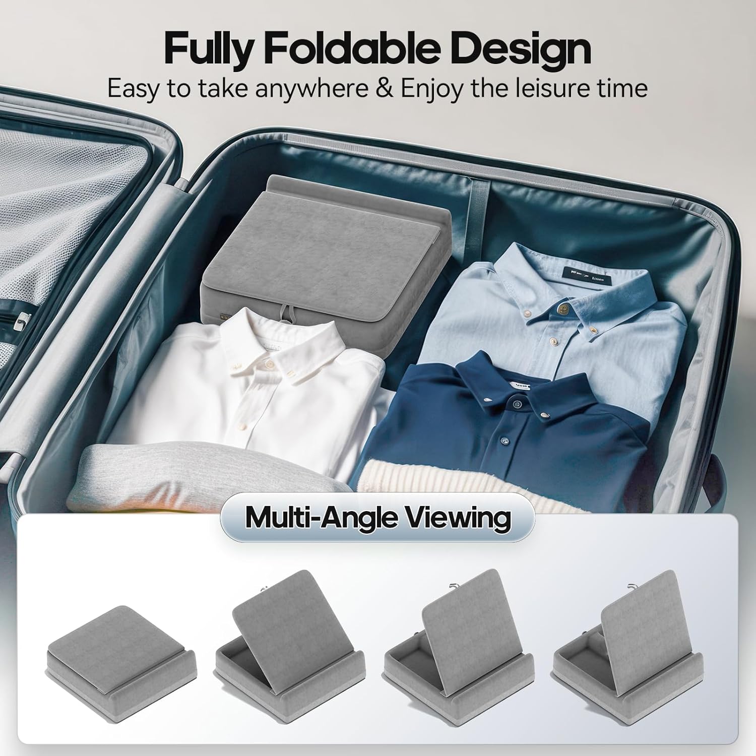 - Foldable Design - Our newly upgraded tablet stand for lap is lighter and more portable, fully foldable design, easy to carry, can be easily put into luggage without taking up space, perfect for traveling. The portable iPad pillow stand is perfect for carrying around for long trips in the car or on the plane.