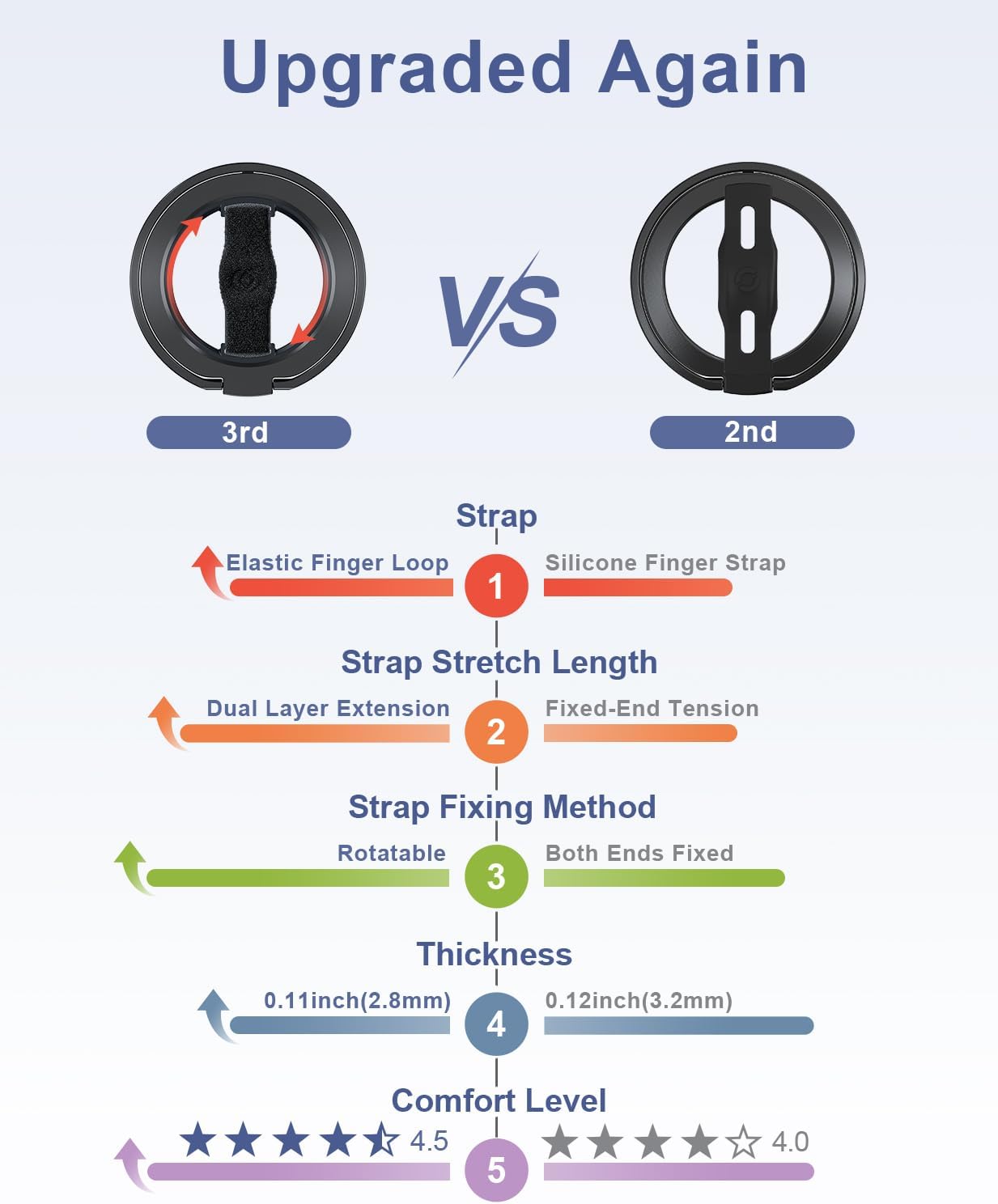 - Comfortable Elastic Phone Grip: This strap features a more comfortable and highly stretchable, high-elastic strap. With its extended length, it greatly reduces the pressure on the fingers when using the strap. The strap is fixed on a rotatable inner ring, allowing you to easily adjust your phone to the most comfortable angle while using the grip.