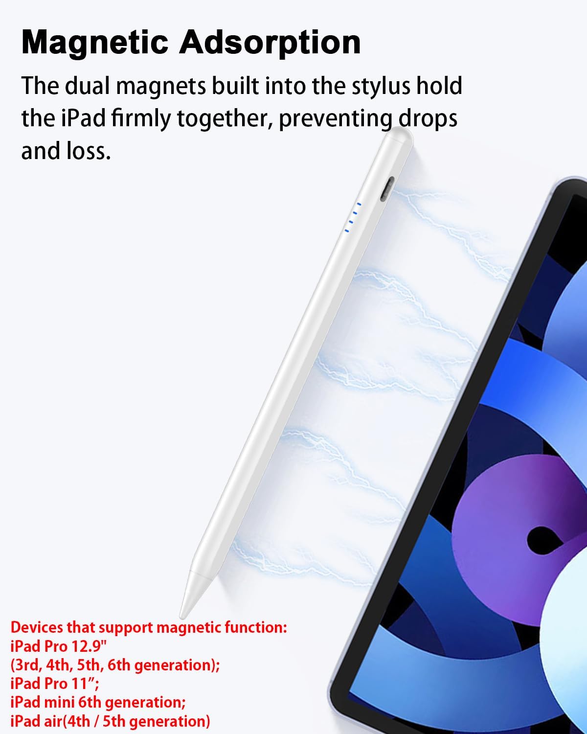 - 【Palm Rejection / Magnetic Function】 The stylus pen for ipad has Palm Rejection function, no need to wear gloves when writing, you can rest assured that your hand on the screen drawing, for your fine writing Drawing convenience. This iPad Tablet Pen is also built-in two magnets, which can be attached to the side of iPad Pro 11-inch (1/2/3 Gen), iPad Pro 12.9-inch (3/4/5 Gen), iPad Air (4/5 Gen), and iPad mini 6, so it never scrolls away. (Note: This stylus pen does not support wireless charging)