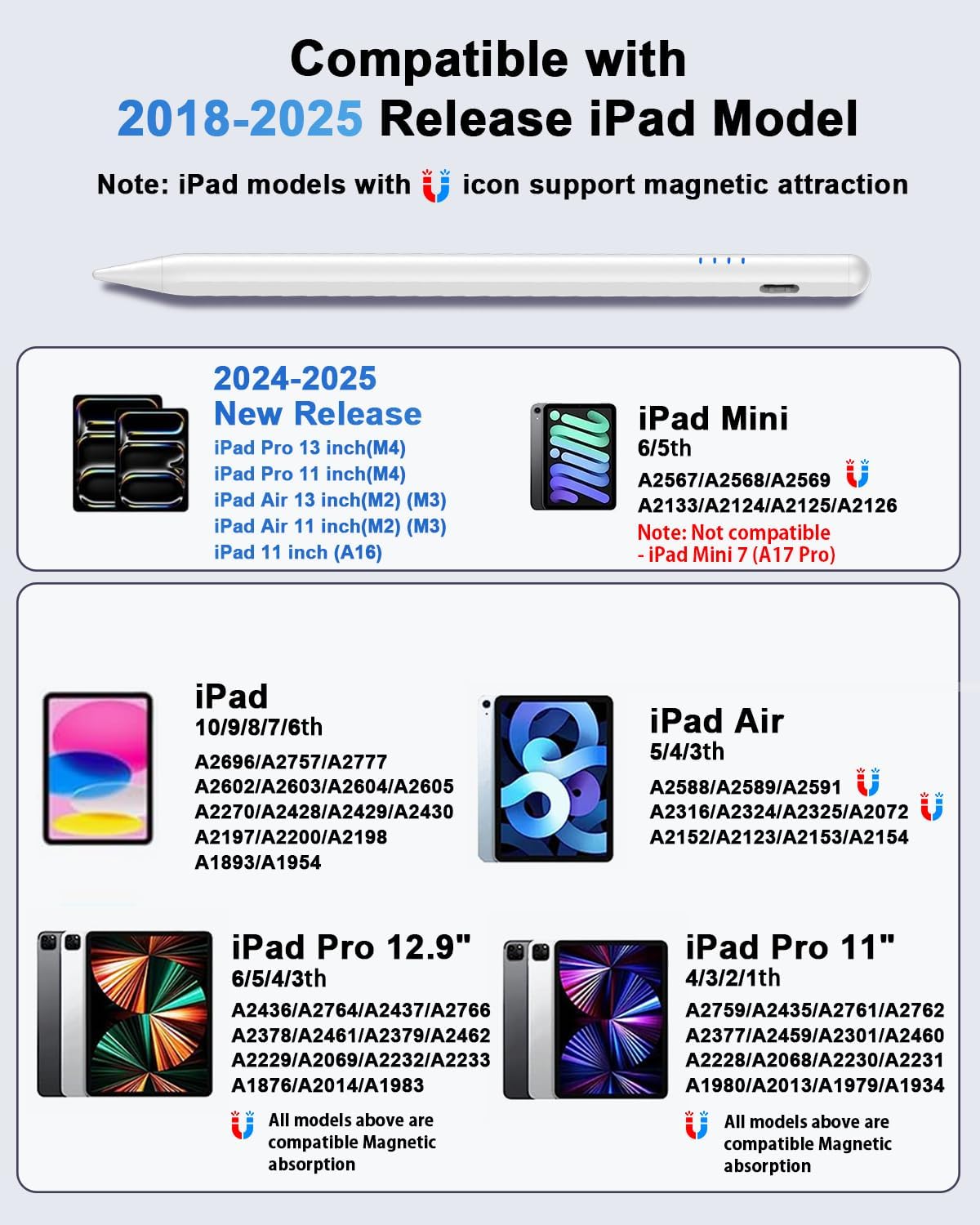 - 【Only Compatible with iPad】 This iPad pencil is Only compatible with 2018-2025 apple iPad Air 11-inch & 13-inch (M2) (M3), iPad Pro 11-inch & 13-inch (M4), iPad 6/7/8/9/10/11(A16) Gen, iPad Pro 11-inch 1/2/3/4 Gen, iPad Pro 12.9-inch 3/4/5/6 Gen, iPad Air 3/4/5 Gen, iPad Mini 5/6 Gen.【Note】This stylus is NOT compatible with models prior to 2018 and does NOT work with iPhone, Android and Microsoft devices. Before purchasing, please make sure to check the model on the back of the iPad