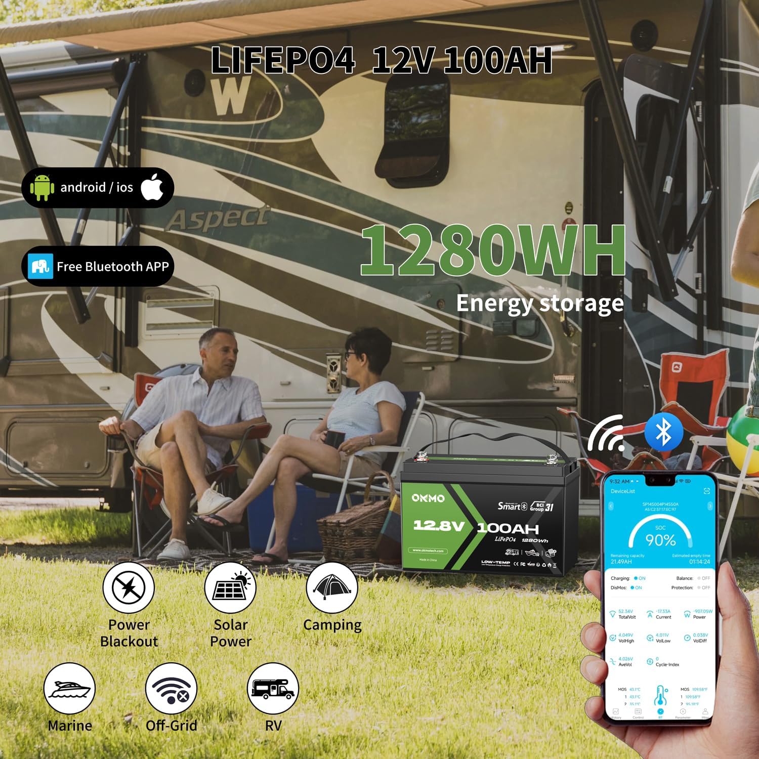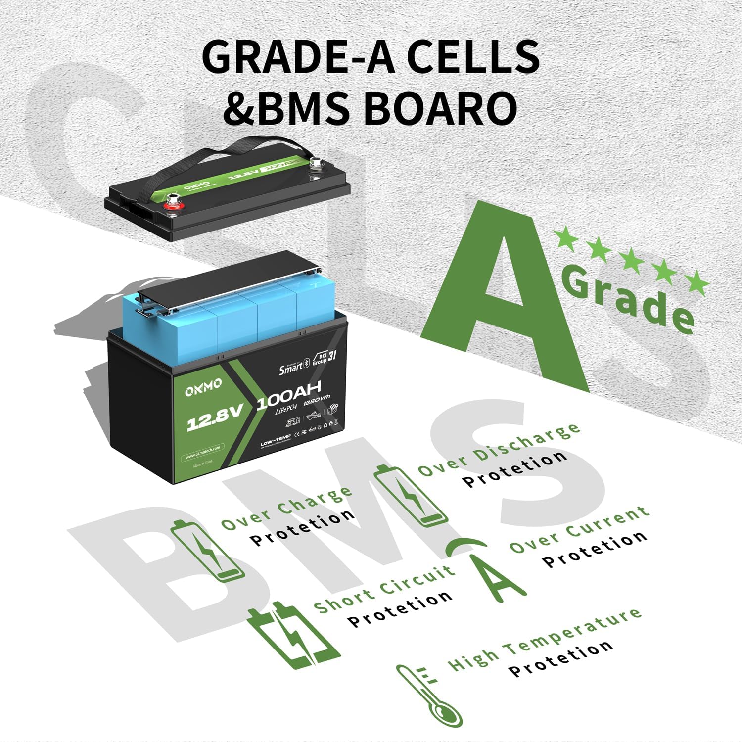 - 【A-Grade Cells & Upgraded 100A BMS】: The OKMO 12.8V 100Ah premium LiFePO4 battery redefines excellence. Powered by four A-grade LiFePO4 cells, it offers higher energy density and unmatched power. The 100A BMS provides fortress-like protection against overcharge, over-discharge, overcurrent, overvoltage, overload, and short circuits.