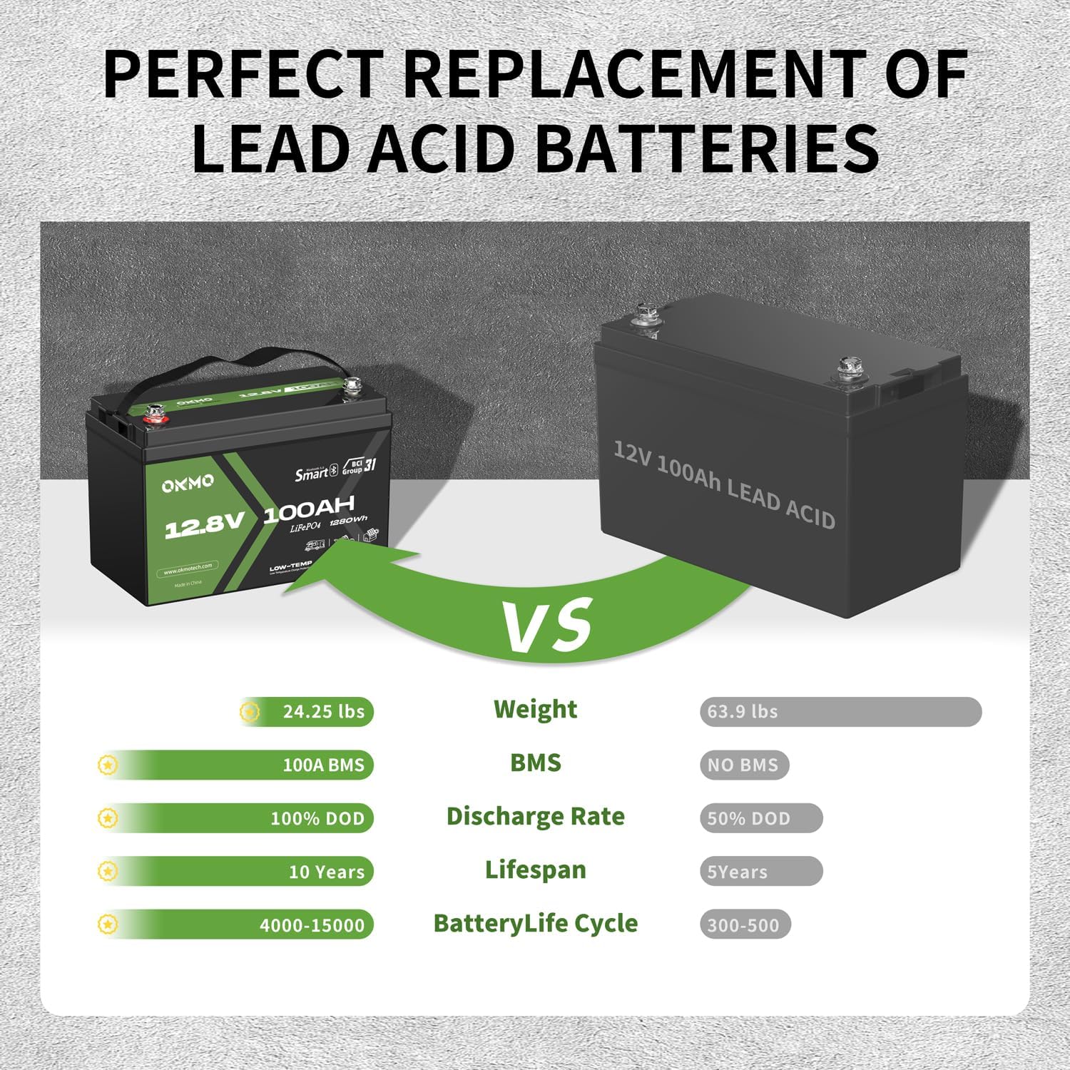OKMO 12V 100Ah LiFePO4 Battery, Lithium Battery 100A BMS, 10 Years Lifetime 15000+ Deep Cycles,for Marine, RV, Trolling Motor, Boat, Camper, Solar Home Iron Phosphate, Low Temperature Protection