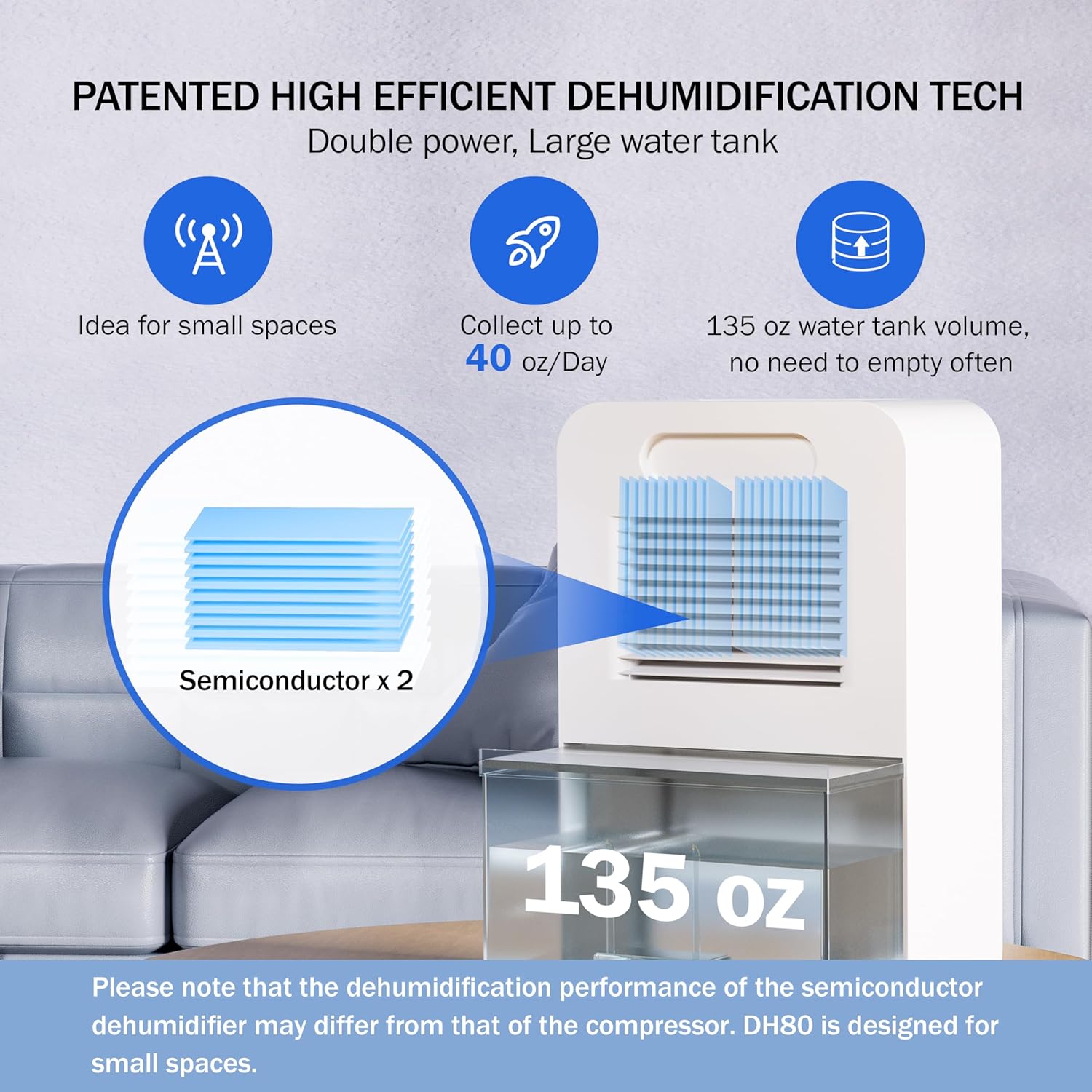 - ⭐Please note that the dehumidification performance of the semiconductor dehumidifier may differ from that of the compressor. DH80 is designed for small spaces. Instead of reducing humidity blindly, it balances humidity according to the room's humidity and temperature for an ideal range. Cannot manually set the humidity.