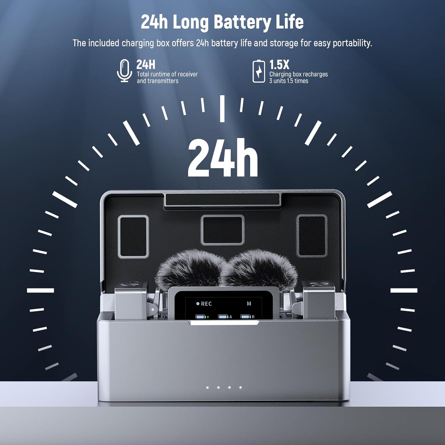 - 【24 Hours of Extended Battery Life】 With optimized power efficiency, the RX and TX run up to 9.5 hours (REC off). The charging case fully recharges them 1.5 times in about 2 hours per charge, providing a total of 24 hours of use—sufficient for recording all day long