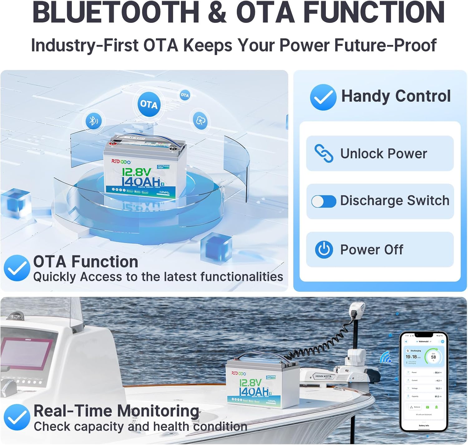 - 【Smart Bluetooth & OTA Function】Easily monitor and control your marine starting battery 12v via smartphone. Besides, this battery features OTA (Over-The-Air) upgrade, enabling direct updates to new Bluetooth software and access to the latest functionalities.