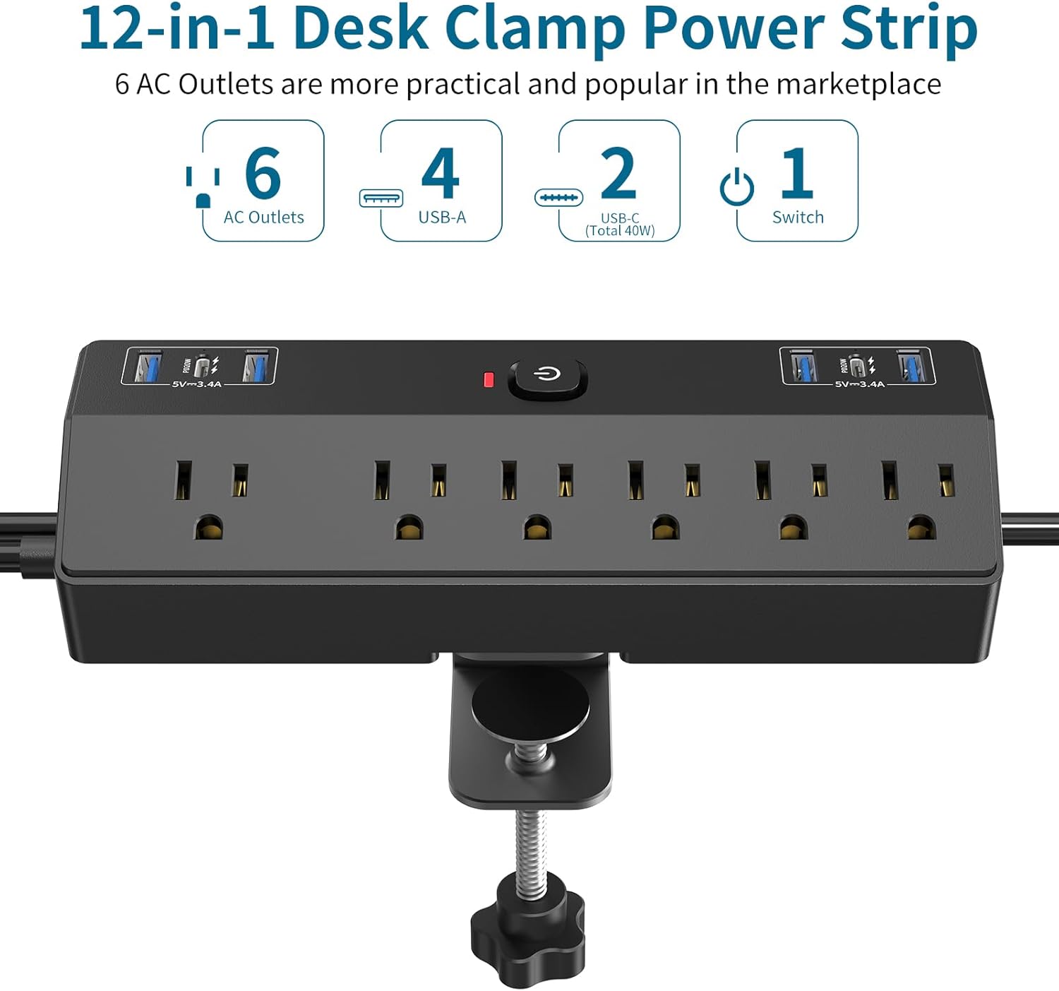 - 【12-in-1 Desk Clamp Power Strip】-This Multi Outlet Plug desk power strip surge protector combines 6 AC Outlets (1625W 13A) and 6 USB Ports (4 USB-A, 2 USB C 20W) in a power station to provides power and charging for up to 12 electric devices from this single unit, easily relieve your electricity troubles.