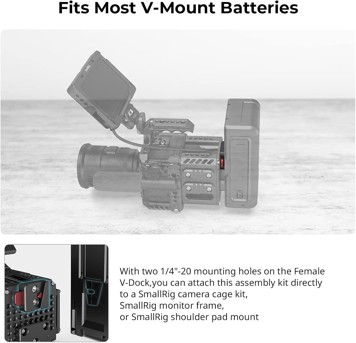 - Comes with Various Mounting Threads: There are two 1/4" -20 mounting holes on the Female V-Dock, and you can attach this assembly directly to a SmallRig camera cage kit, SmallRig monitor frame, or SmallRig shoulder pad mount. The V-Lock with three M3 holes can be used as a replacement of the original V-Lock comes with the V-Mount battery