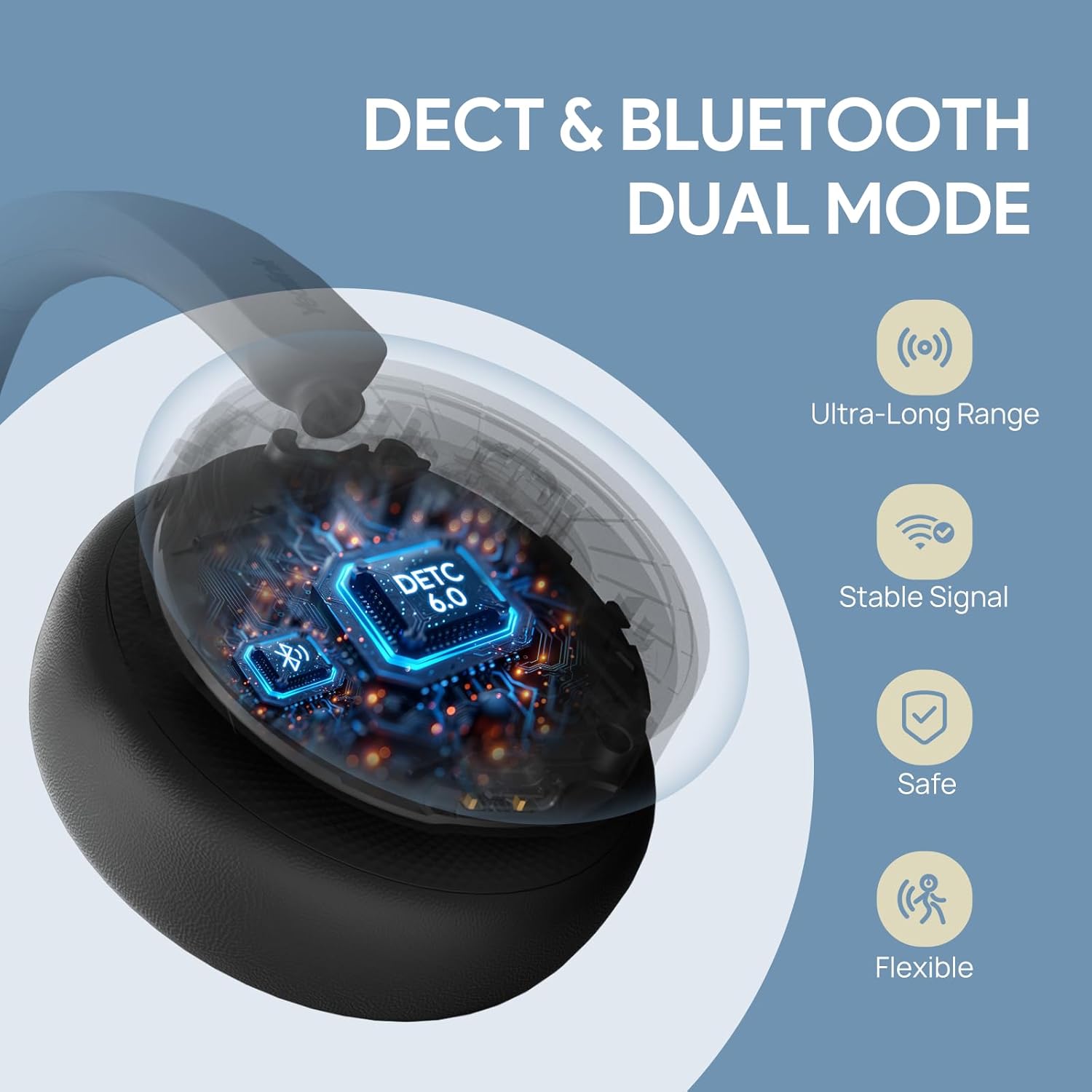 - DECT & BT Dual-Mode: WH64 Hybrid headset with charging stand have DECT and Bluetooth chips, DECT achieves ultra-long wireless range, secure calls, high-density deployment, and flexible Bluetooth mobility