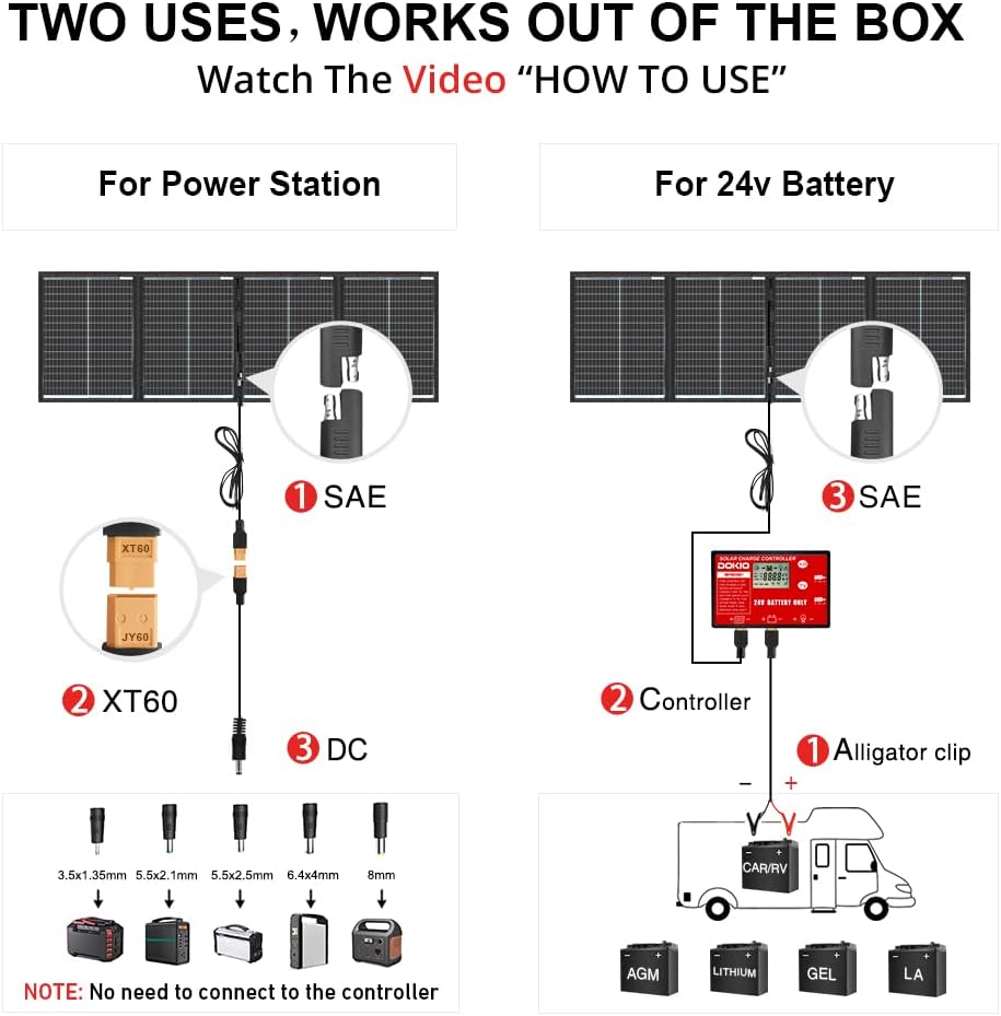 - 【All-in-One Kit with Accessories】Includes 200W folding panel, PWM controller, 9.8 ft (3 m) cable, 3.3 ft (1 m) cable, adapters, and manual. Optional 19.7 ft (6 m) XT60 extension cable and mounting bracket available separately.