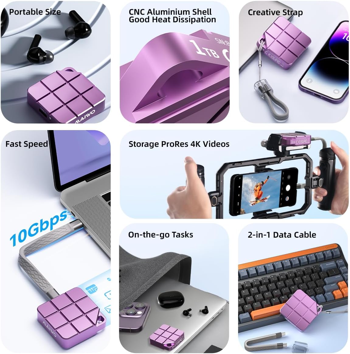 - 【Compatibility】This portable external SSD is compatible with iPhone 15 Pro and later version via Type-C interface, support recording 4K ProRes videos, can save images and videos at the same time, perfectly choice for expanding storage space for Macbook Pro/PS4/PS5/Smartphone/Laptop/Tablet/Drone/Gaming Console. It is suitable for Windows/MacOS/Android/Harmony OS/Linux/iOS. Compatible with Thunderbolt 3, Thunderbolt 4, USB4.0