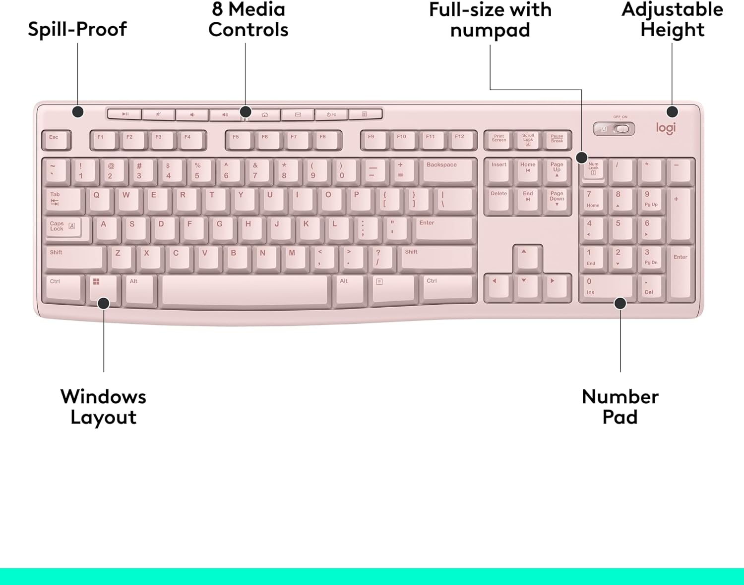 Logitech K270 Wireless Keyboard for Windows, 2.4 GHz Wireless, Full-Size, Number Pad, 8 Multimedia Keys, 2-Year Battery Life, Compatible with PC, Laptop - Rose