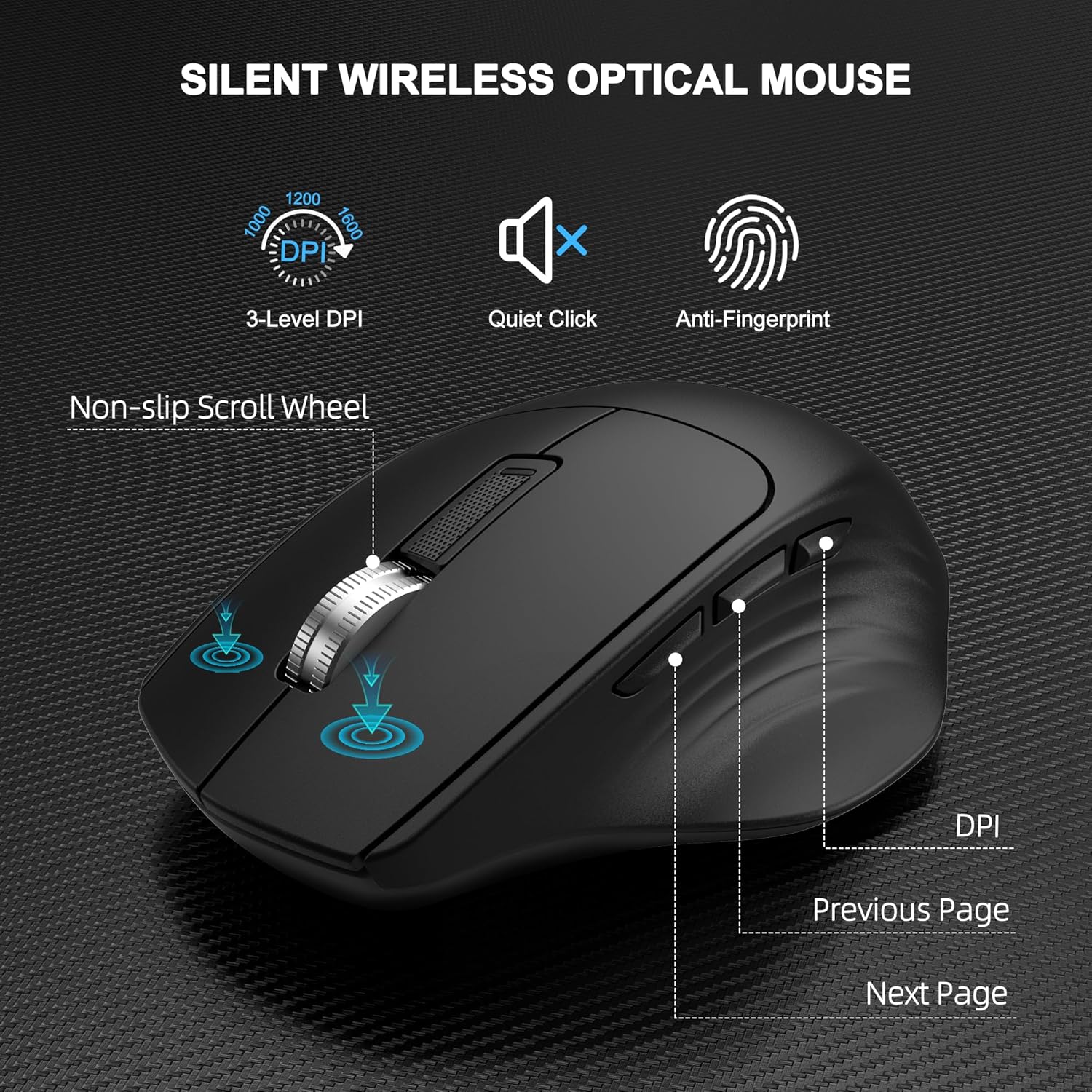 - ▶【Convenient Wireless Keyboard and Mouse】The wireless keyboard features 12 multimedia hotkeys, provides convenient access to the Internet, E-mail and more. The 5-button optical mouse with 3 adjustable DPI(1000/1200/1600) and forward/backward functions allow you to easily navigate the web or documents. Enjoying precise operation, with almost complete silent clicking for a seamless smooth user experience.