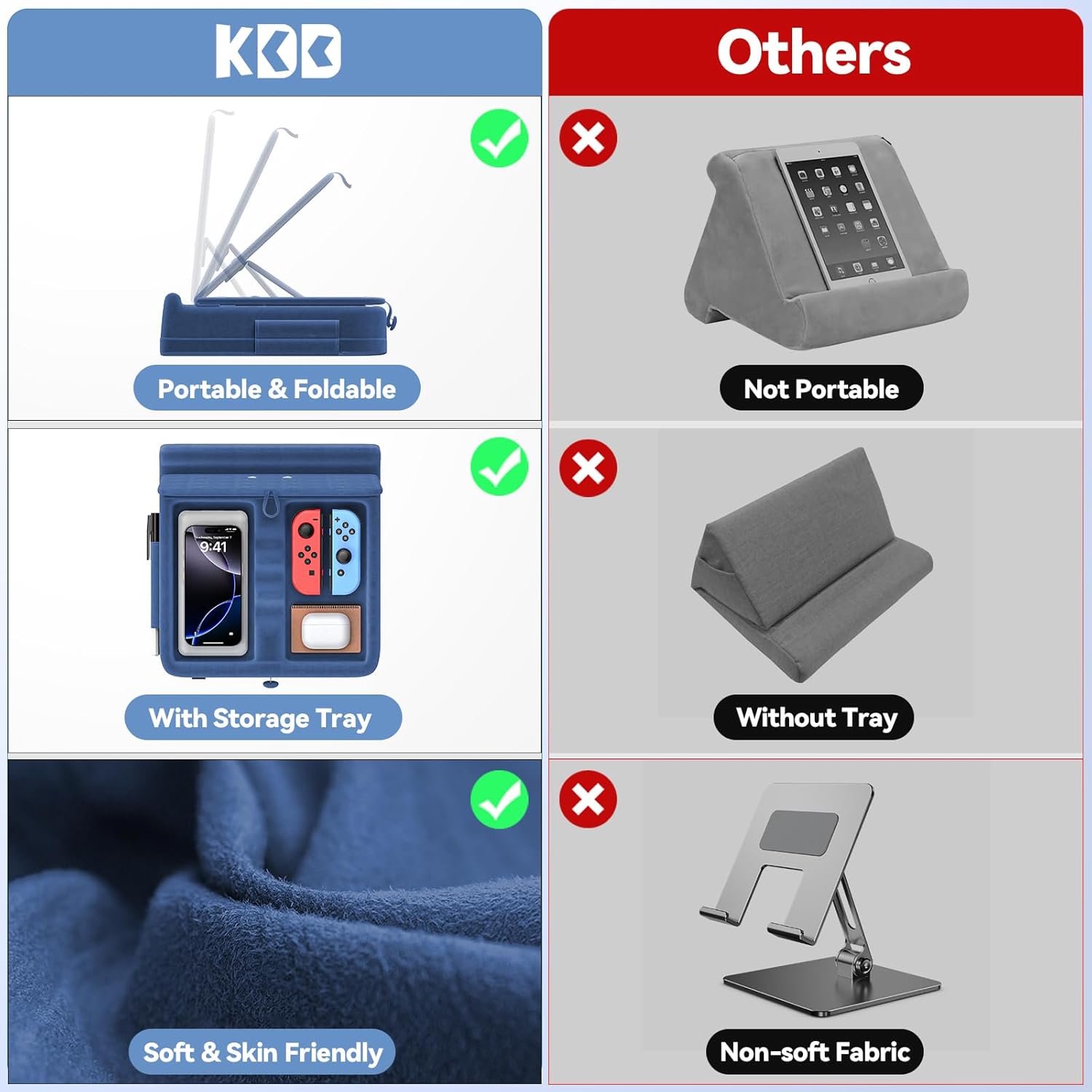 KDD Tablet Pillow Stand with Storage, Foldable iPad Holder for Lap, Desk and Bed, Angle Adjustable Soft Pad Dock with Stylus Mount Compatible with iPad Pro, Air, mini, Book, Phone and Tablet (4-13")