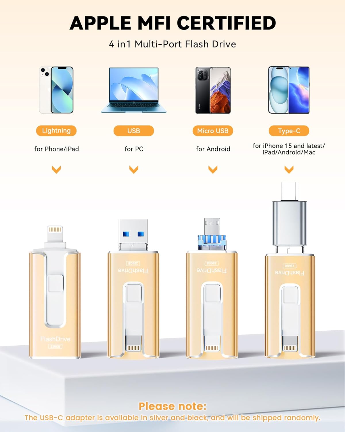 - 【Multi Port Design, Plug and Play】Equipped with USB/Lightning/Micro USB/Type-C (with independent adapter), this usb storage flash drive supports a variety of devices for effortless plug and play operation. Quickly transfer data between different devices, significantly enhancing convenience. Please note: Type-C adapter is shipped randomly in black or silver.