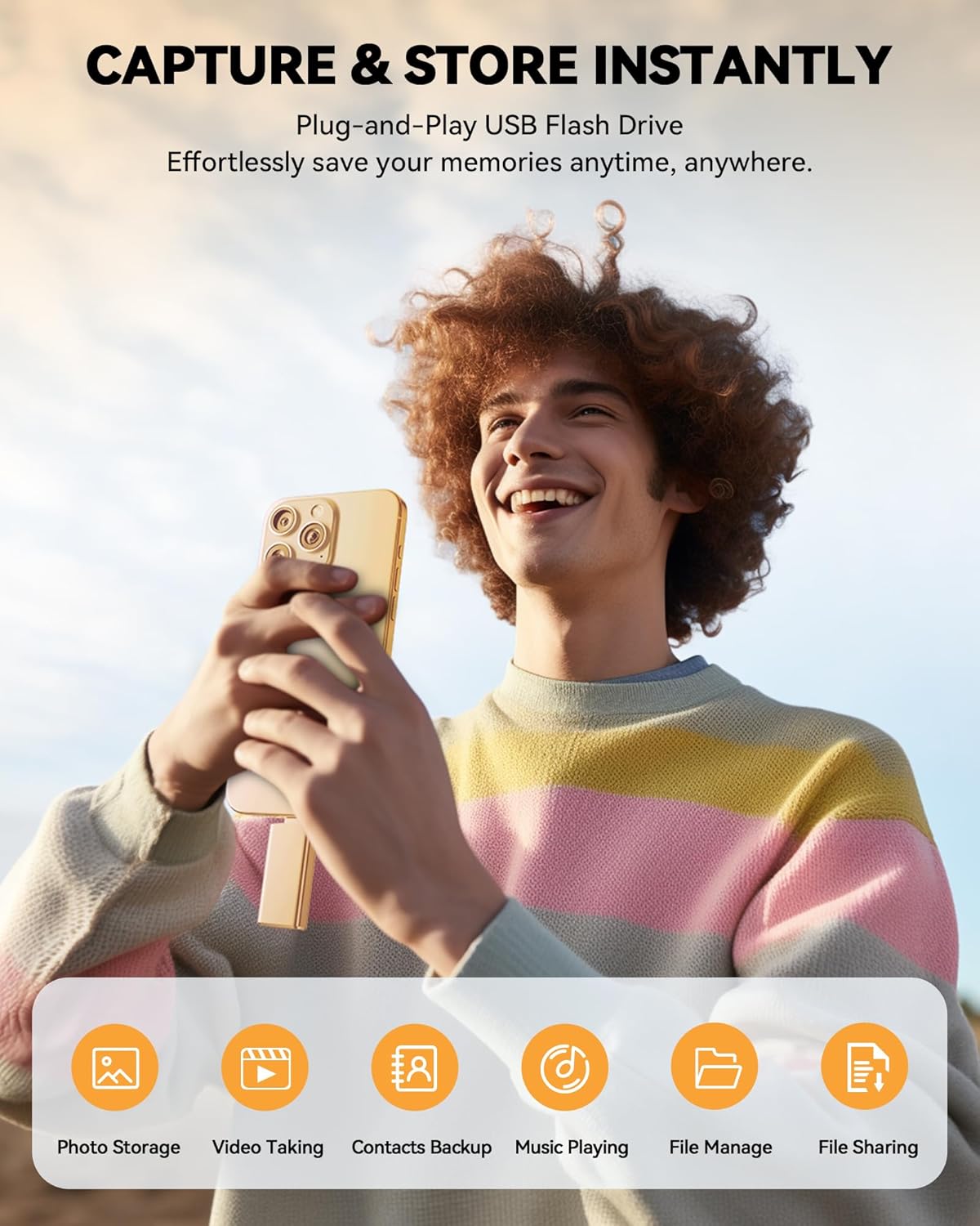 - 【Stylish, Portable, and Secure】With a compact and stylish design, this flash drive for iPhone is available in blue, pink, black and gold, making it easy to carry around. The built-in encryption option allows you to set a password via the APP to secure your personal files, photos and videos, ensuring you have peace of mind when storing and accessing your precious memories while traveling or for daily use.