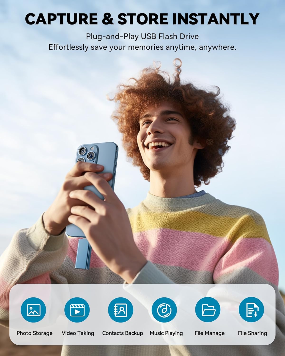 - 【MFi Certified Flash Drive, Wide Compatibility】This 256GB USB flash drive for iPhone is officially MFi certified, ensuring full support for all iOS devices (iOS 12.1 and above). NOTE: For iPhone users, please download the required app from the App Store before use, while Android only needs to open your OTG function.