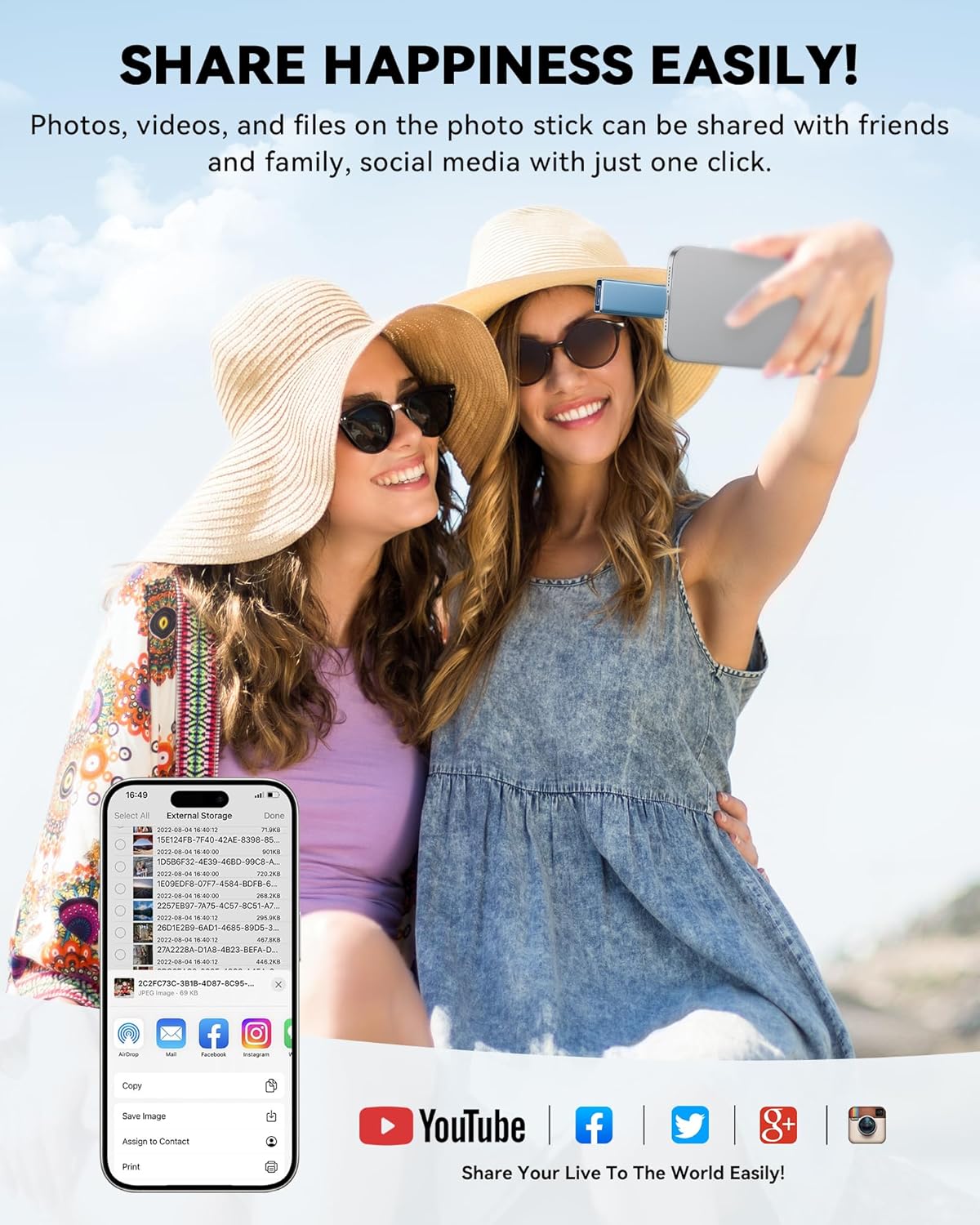 - 【Stylish, Portable, and Secure】With a compact and stylish design, this flash drive for iPhone is available in blue, pink, black and gold, making it easy to carry around. The built-in encryption option allows you to set a password via the APP to secure your personal files, photos and videos, ensuring you have peace of mind when storing and accessing your precious memories while traveling or for daily use.