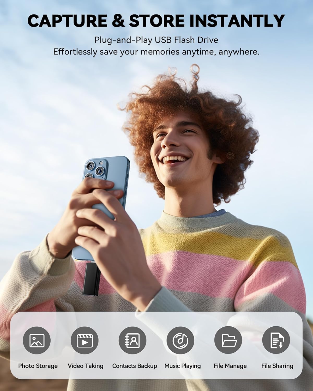 - 【Large Storage Capacity, Backup Easily】With 256GB of additional storage, this iPhone flash drive perfectly addresses memory shortages on your phone or iPad. Whether you're capturing short videos or selfies, simply plug the memory stick in your device, easily back up your photos, videos, and files, share your special moment with your friends and family on your social media with just one-click.